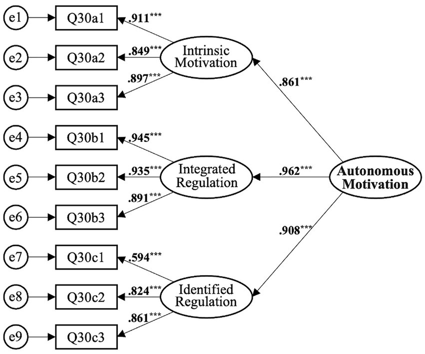 (3) Item parceling. SEM analysis typically requires a sample to observed variable ratio of at least 10:1 (Thompson, 2000). Given the challenge of obtaining overseas sample data, the small sample size, and the complexity of the model, this study, based on the reliability and validity tests of the scales’ latent variables, parceled single-dimensional, homogeneous latent variables. For instance, under the second-order model of autonomous motivation, three first-order indicators were separately parceled, such as Q30a = (Q30a_1 + Q30a_2 + Q30a_3)/3. To further address these challenges, the high-medium loading method was employed for item parceling (Wu and Wen, 2011). This method involves arranging items based on their factor loadings from highest to lowest and then creating groups that each contain a high-loading, a medium-loading, and a low-loading item, thereby ensuring a balanced representation of item loadings within each parcel. This balanced approach helps in maintaining the integrity and variability of the underlying construct across the parcels. Applying this method, the Perceived Belonging Scale’s 8 items were parceled into 3 groups, with the first group including items Q29_11, Q29_5, Q29_10; the second group containing items Q29_6, Q29_7, Q29_8; and the third group including items Q29_4, Q29_2. Similarly, the Perseverance in Teaching CMAs Scale’s 5 items were parceled into 3 groups, with the first group containing items Q8_1, Q8_6; the second group containing items Q8_2, Q8_5; and the third group containing item Q8_3. Through this method, we ensured that each parcel accurately represents the construct’s range of factor loadings, thereby facilitating a more reliable analysis within the constraints of our study’s sample size and structural complexity.