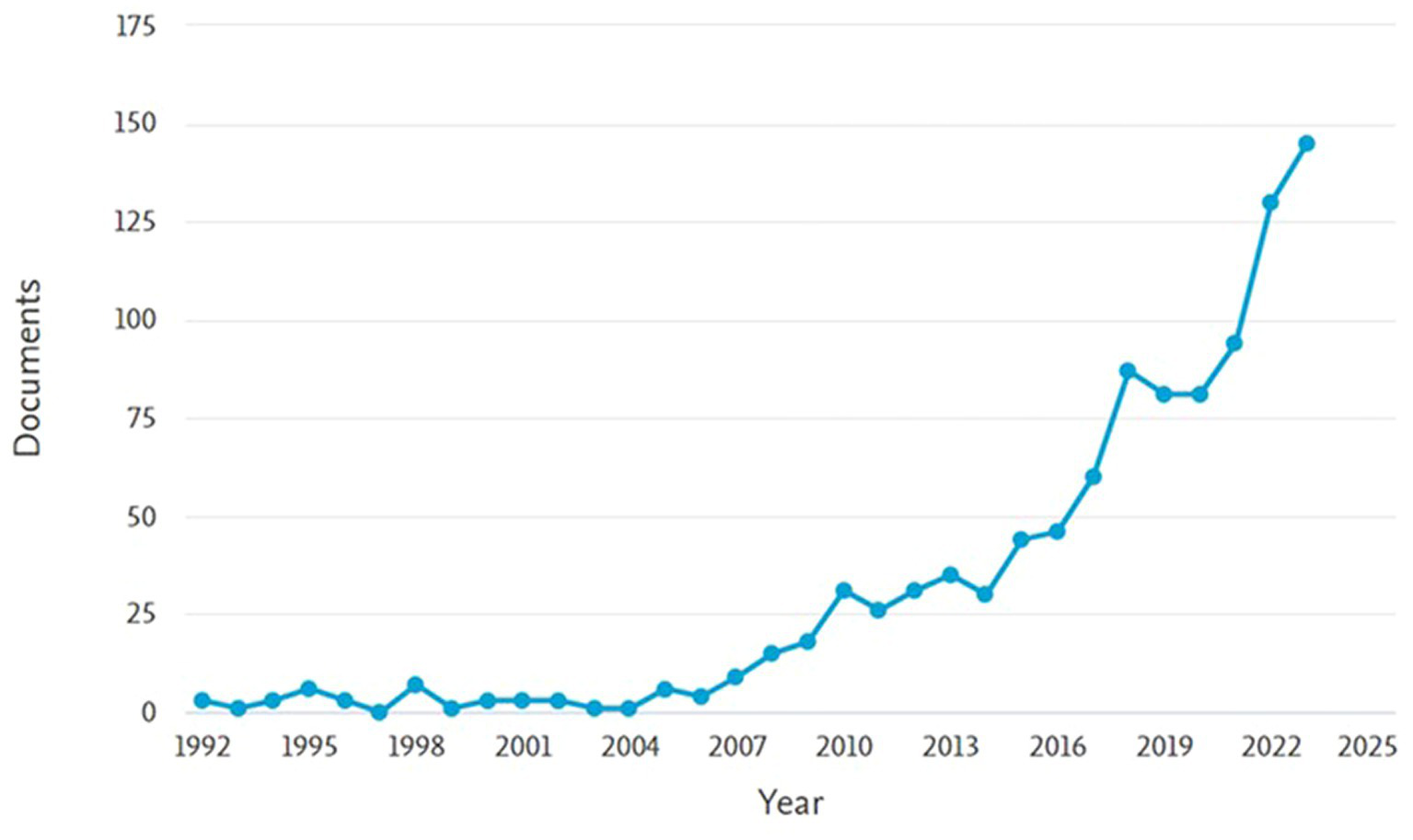 The descriptive analysis showed that 69% of the studies (N = 662) were published in psychology, while 31% (N = 293) of research were published in marketing. The year when more articles have been published is 2023 (N = 145), followed by 2022 (N = 130), and 2021 (N = 94). This shows that the majority of research has been published in the last few years, with more than 50% published since 2019 and more than 80% in the last decade (see Figure 2).