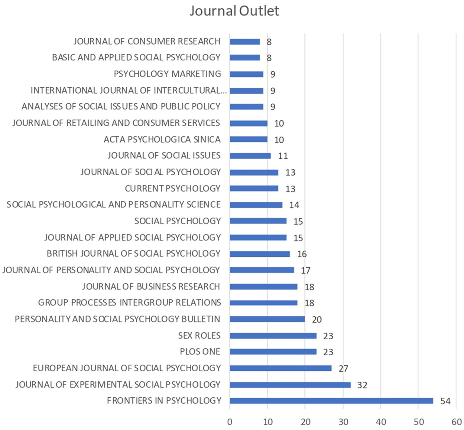 The journal that published more articles was Frontiers in Psychology (N = 56; 5.27%), followed by the Journal of Experimental Social Psychology (N = 32; 3.3%), and European Journal of Social Psychology (N = 27; 2.8%). In marketing and consumer behavior, the journals that published more articles were the Journal of Business Research (N = 18; 1.88%), Journal of Retailing and Consumer Services (N = 10; 1%), Psychology and Marketing (N = 9; 0.88%) and Journal of Consumer Research (N = 8; 0.8%) (see Figure 3).