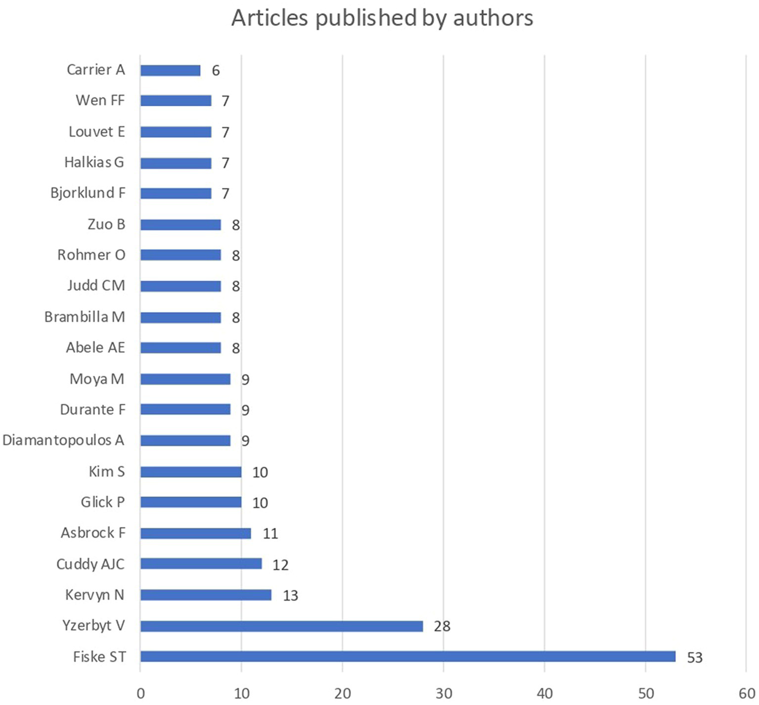 The authors that published more articles were Susan T. Fiske (Princeton University, United States) (N = 53), followed by Vincent Yzerbyt (Université Catholique de Louvain, Belgium) (N = 28), Nicolas Kervyn (N = 13), Amy Cuddy (Harvard University, United States) (N = 12), and Frank Asbrock (Philipps University of Marburg, Germany) (N = 11) (see Figure 5). The studies by Fiske et al. (2002, 2007) were the ones with the higher number of citations (i.e., 4,131, and 2,384 citations respectively), followed by the research by Cuddy et al. (2007, 2008); 1,319 and 1,139 citations respectively), and Judd et al. (2005) (691 citations).