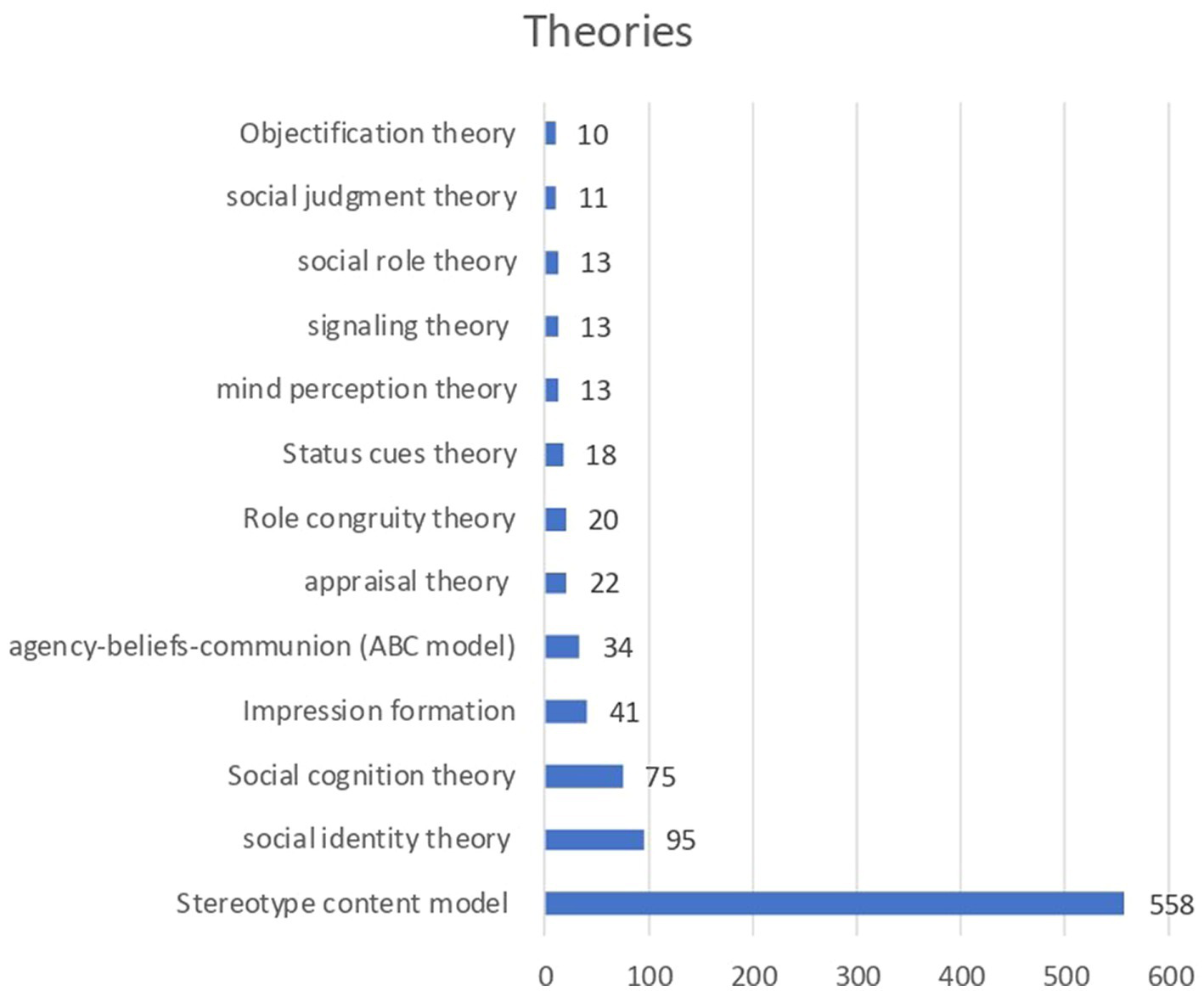 To identify theories, we examine the abstracts, searching for the keywords “theory” or “model.” In total, 777 articles mentioned a theory or model in the abstract, and 66 theories overall, but some articles used more than one theory. Besides the SCM (N = 598), some articles used the agency-beliefs-communion (ABC model; N = 34), a model by Koch et al. (2016) that builds on the theoretical foundations of the SCM. This model can be used in research as an alternative to the SCM when examining how individuals mentally organize and categorize different social groups. The authors suggest that individuals spontaneously organize social groups based on their agency/socioeconomic success (A), and on their conservative–progressive beliefs (B). Communion (C) (i.e., caring for others, involving qualities such as benevolence, cooperativeness, and empathy) was not found as a dimension on its own, but rather as an emergent quality in the two-dimensional space of A and B.