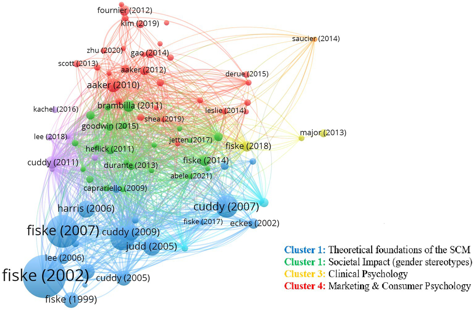 The analysis shows that the main theoretical foundations by Fiske et al. (1999, 2002, 2007), and Cuddy et al. (2007), provided the essential bases on which all future research built (cluster 1; 23 articles). As observed in Figure 3, this research represents the bottom of a “pyramid,” over which research in social psychology built. This second stream (cluster 2; 12 articles), located over the bottom, examined the societal impact of individuals’ perception of stereotypes of specific groups, with special emphasis on gender stereotypes (e.g., Heflick et al., 2011; Heflick and Goldenberg, 2011). This second stream formed a core of research around which more recent research built. Another research stream identified is associated with clinical psychology and child development (e.g., de Haan et al., 2009; Major et al., 2013; Buist and Vermande, 2014) (cluster 3; 17 articles). Finally, one research stream includes research in the field of marketing (e.g., Aaker et al., 2010, 2012; Zhang et al., 2023) (cluster 4; 22 articles). The next subsections explore each of these streams in more detail.