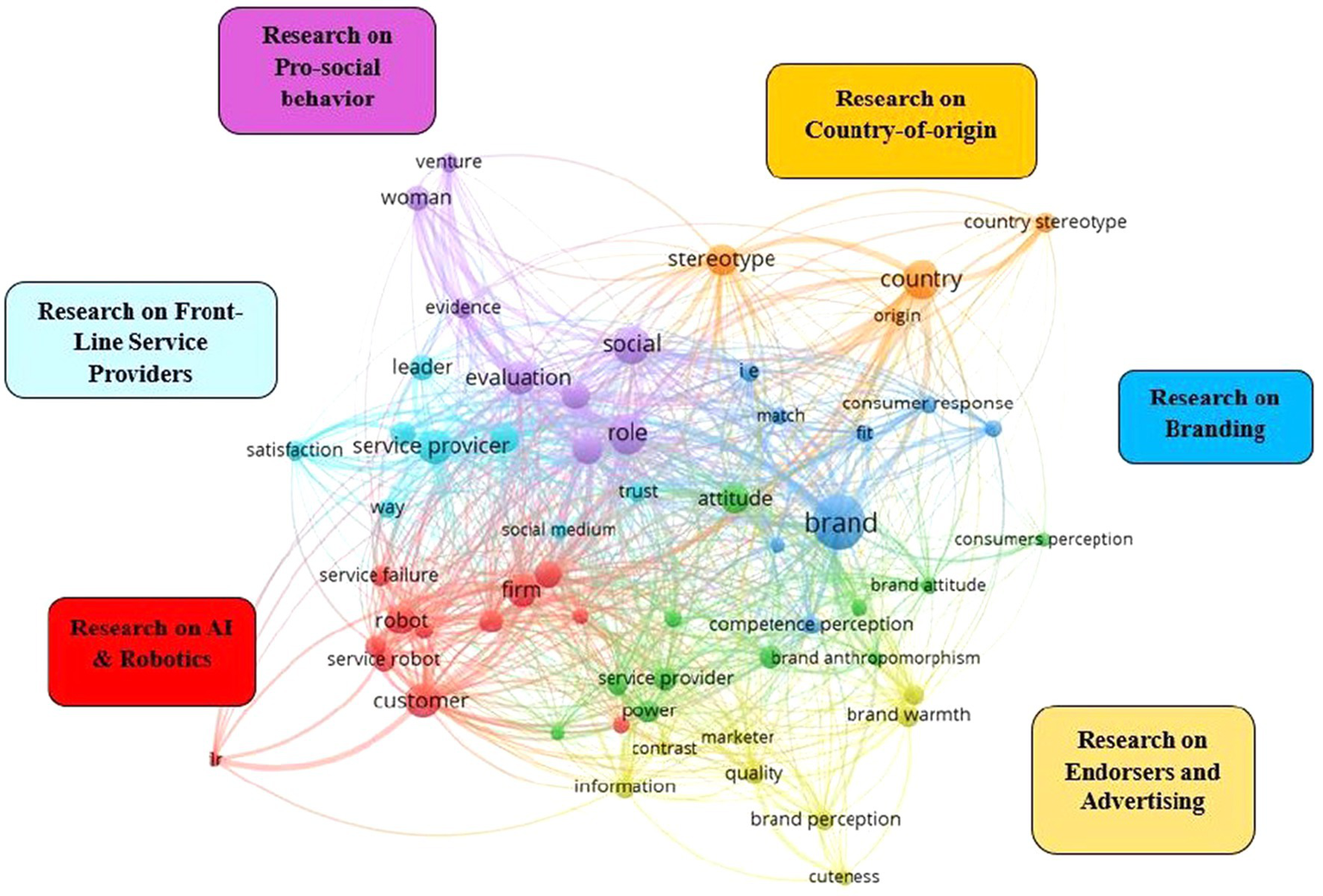 Recent scholars in marketing that have used the SCM have mentioned the need for further research in this field (Leung et al., 2023; Pizzi et al., 2023; Ren et al., 2023). The authors indicated that, while the influence of the two main traits has been more widely studied in psychology, more research is needed to uncover how these traits influence consumers’ decision-making (Kolbl et al., 2019, 2020; Diamantopoulos et al., 2021; Gidaković et al., 2022) and behavior in the market (Halkias and Diamantopoulos, 2020; Pizzi et al., 2023). Following this need for research, in the present study, we first take a closer look at prior findings in marketing and consumer behavior. To conduct this part, we used co-occurrence analysis, only using the studies in the field of marketing. Some authors mentioned that co-occurrence analysis is useful to identify research topics inside a research stream (Mariani et al., 2022). We used VOSviewer. This software places a premium on graphical representation for co-occurrence analysis as well as for bibliometric coupling (Van Eck and Waltman, 2009; Oladinrin et al., 2023), providing several benefits, including a comprehensive identification of topics that allows to synthesize prior findings, and a transparent set of results offered with a reproducible rigorous process (Mariani et al., 2022; Oladinrin et al., 2023). In this case, the predefined number of co-occurrences (i.e., 10) provided a good visualization map, thus, we opt for this criterion to perform the analysis. Through this process, we identified six research streams: (1) branding, (2) country stereotypes (emphasizing the effect of country-of-origin), (3) perception of providers in front-line service, (4) prosocial behavior, (5) perception of endorsers in marketing communications, and, more recently, (6) perception of AI and robots (Figure 8).