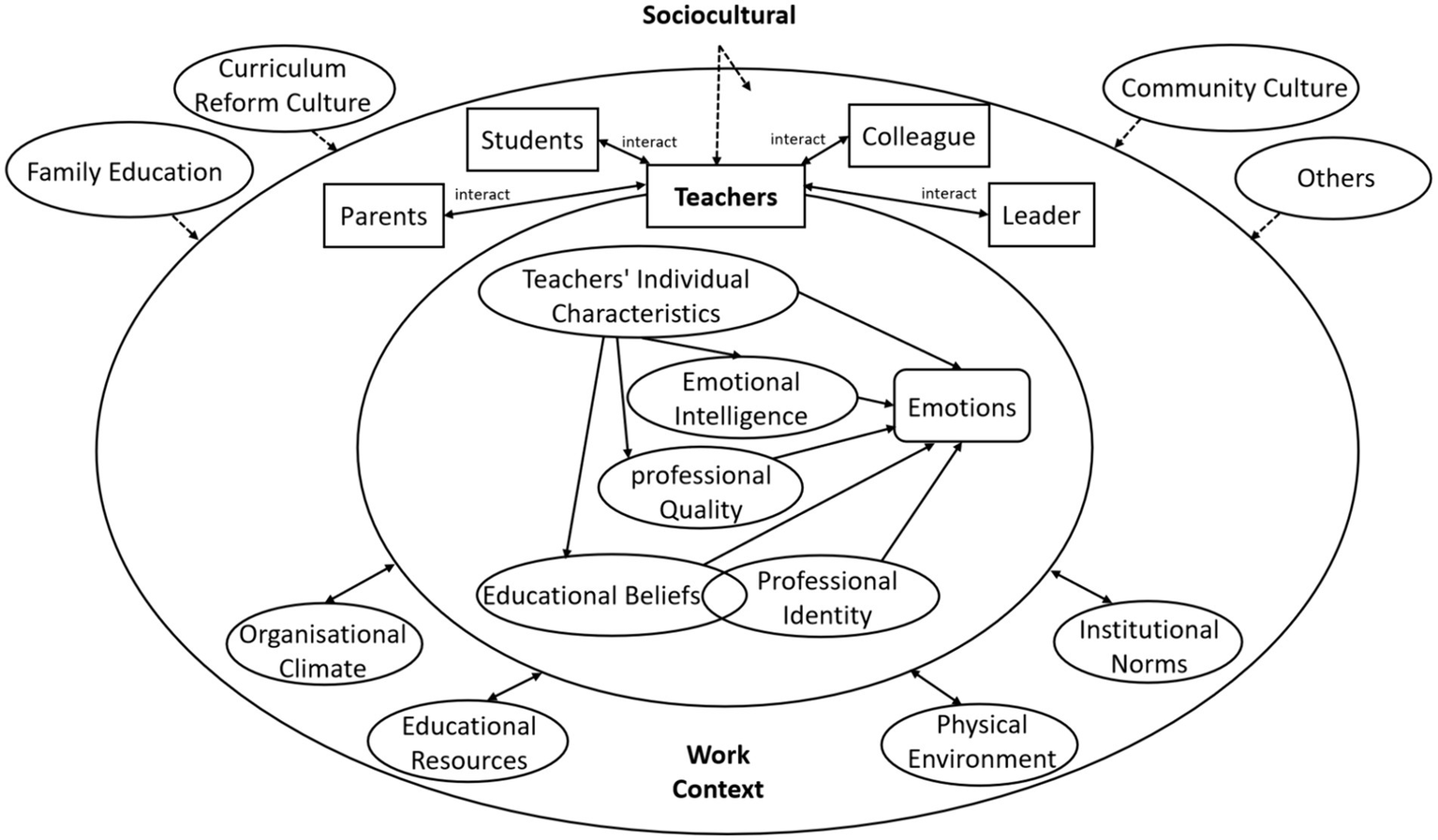 Teachers’ personal attributes are in the direct area of the model and directly govern the formation of their emotions, while their work context consists of a transitional area in emotion formation and the sociocultural system acts as the latent band influencing emotion development. The mechanism model helps us to understand and recognise teachers’ emotions and to explore their pedagogical implications.