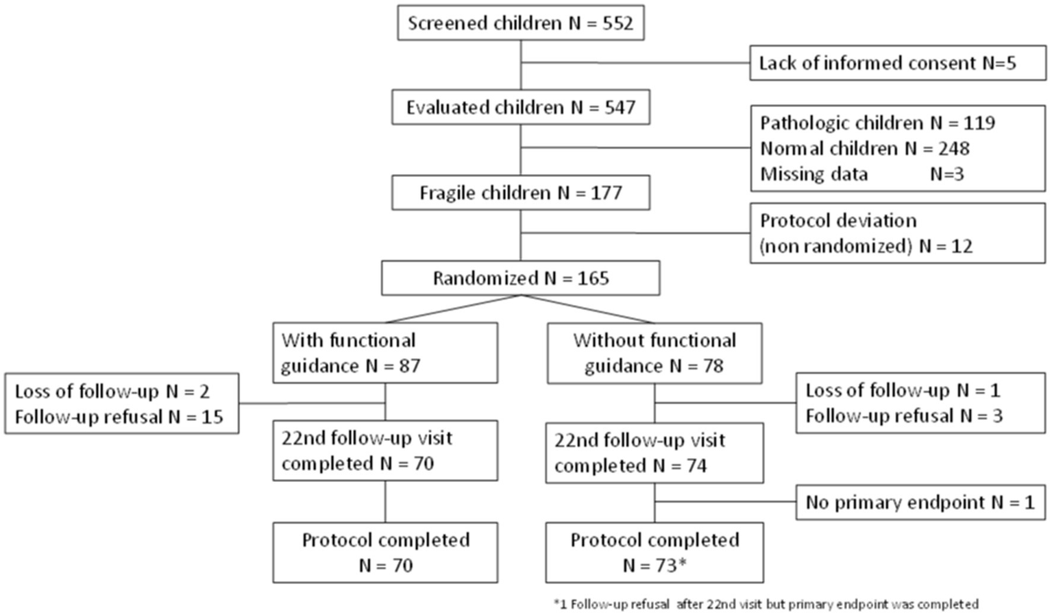 Overall, 552 children who were referred to our tertiary care center between 31 August 31 2011 and 29 August 2014, including five whose parents refused participation, were screened (see Figure 1). The follow-up ended on 27 February 2015. Five children who did not provide informed consent were excluded. Among the 547 screened children, 177 were classified as “fragile,” but only 165 participants of a mean age of 3.6 ± 0.1 years were randomized (fragile group), which is 63.5% of the target sample size. Of the 165 randomized participants (87 in the rehabilitation group and 78 in the group without rehabilitation), the primary endpoint was available in 86.7% of the cases (143/165): 70/87 (80.5%) in the rehabilitation arm and 73/78 (93.6%) in the control arm.