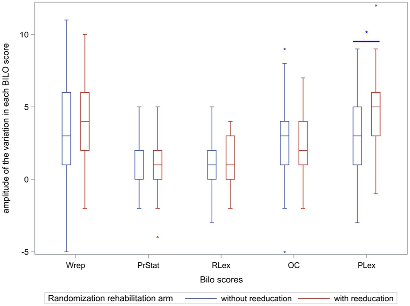 The primary outcome was the extent of the variation in the BILO Petits phonology score between the first and the last study visits (correct word repetition) in each arm (with or without rehabilitation) (Charollais et al., 2010). Therefore, the primary endpoint measure was defined as the difference between the BILO score at the baseline and the BILO score at the end of the study. Secondary endpoints were the extent of the variation in the BILO score for other components (reception and production lexicon, production of statements, and oral comprehension) (Charollais et al., 2010).
