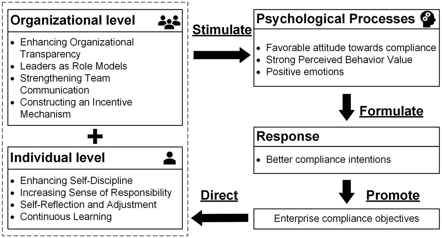 In corporate governance, the efficacy of compliance management in curbing non-compliant worker behaviors is critical (Soltes, 2017). Worker compliance behavior is deeply rooted in their mindset and intentions (Furnham, 2012). The complexity and diversity of international construction projects require flexibility and precision in worker decision-making (Ofori, 2015). Environmental factors such as legal constraints, organizational climate, and project pressures significantly influence employees’ perception and emotional response to compliance (Gendolla, 2000; Al Jaffri Saad and Haniffa, 2014). Misconceptions or disagreements among employees about compliance can lead to non-compliant behaviors (Syahputra et al., 2022), emphasizing the need to understand the environmental triggers of psychological processes leading to compliance.