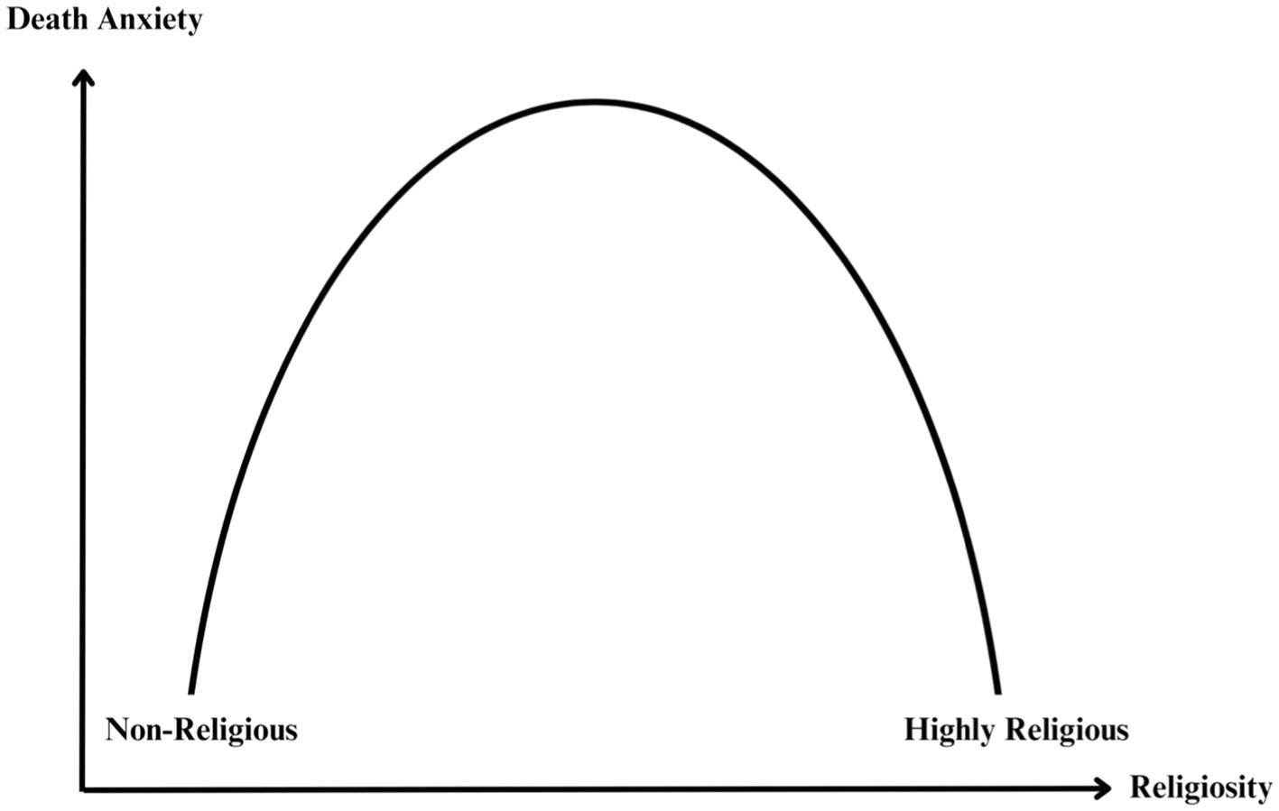 TMT shares some commonalities with the curvilinear relationship. It suggests that individuals with strong religious or atheistic beliefs tend to experience lower levels of DA, while those with moderate beliefs may experience greater DA. According to TMT, this is because people with strong worldviews have a clear sense of either literal or symbolic immortality, which reduces their fear of death. This phenomenon is not limited to religious individuals, as even non-religious people with strong atheistic beliefs may find comfort in the prospect of death through their worldview’s provision of symbolic immortality as a defence mechanism (Jong et al., 2018). On the other hand, those with moderate religiosity may experience a reduction in their sense of literal or symbolic immortality, leading to higher levels of DA. The curvilinear relationship, as explained by TMT, highlights the complex interplay between the intensity of individuals’ religious worldviews and the level of DA.