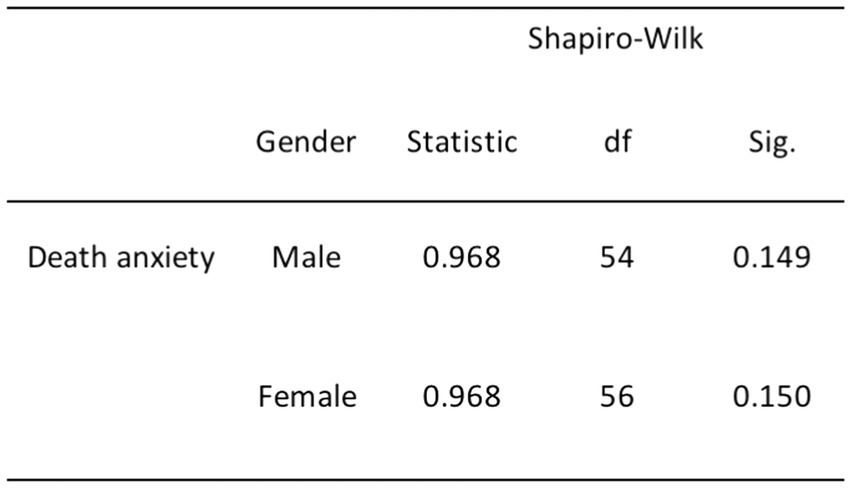 To ensure our data complies with the normality assumptions necessary for parametric tests, we conducted a normality assessment using the Shapiro–Wilk test. This test is suitable for our sample size of 110 since it is designed for use with sample sizes ranging from three to 5,000 (Yap and Sim, 2011). In the Shapiro–Wilk test, the null hypothesis assumes that the data adheres to a normal distribution, while the alternative hypothesis indicates a departure from normality. If the p-value falls below the chosen significance level of 0.05, we reject the null hypothesis. Conversely, if the p-value exceeds this threshold, we fail to reject the null hypothesis, indicating that the data follows a normal distribution.