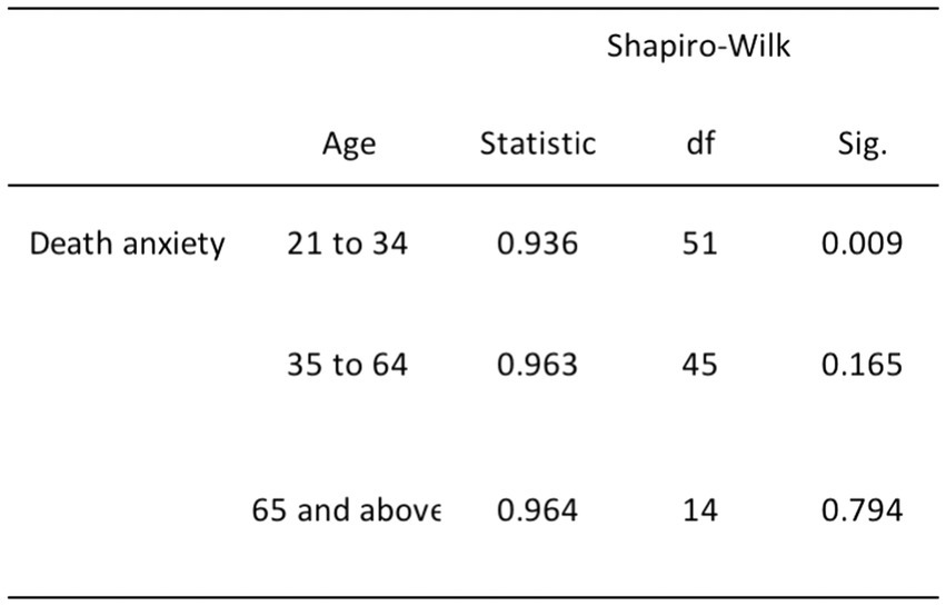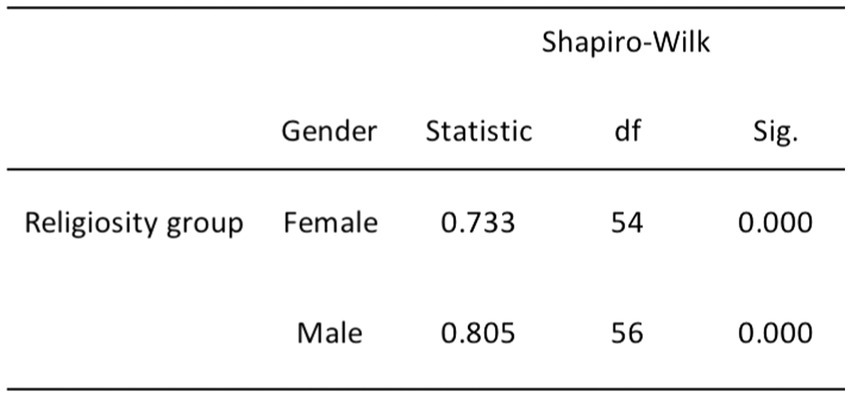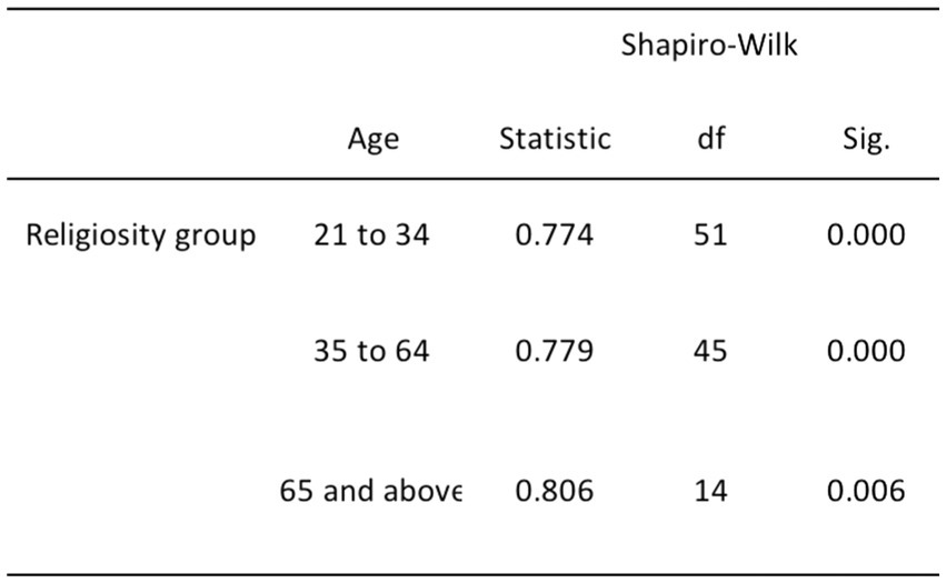 The remaining relationships, which involve DA and age, religiosity and age, and religiosity and gender, exhibited departures from normality. Specifically, we rejected the null hypothesis for DA and age due to the non-normal distribution of the young adult age group (p = 0.009; refer to Figure 4). Furthermore, we rejected the null hypothesis for the relationship between religiosity and age, including both young and middle-aged adults (p < 0.001), as well as older adults (p = 0.006; see Figure 5). Additionally, we rejected the null hypothesis for the relationship between religiosity and both genders (p < 0.001; see Figure 6). Given the presence of statistically significant p-values, indicating deviations from normality, we chose to employ non-parametric tests, such as the chi-square and Kruskal-Wallis tests. These non-parametric tests are better suited for data that do not conform to the assumptions of parametric tests, enabling us to analyze the data effectively while accounting for the observed departures from normality (Yap and Sim, 2011; Gravetter and Wallnau, 2015).