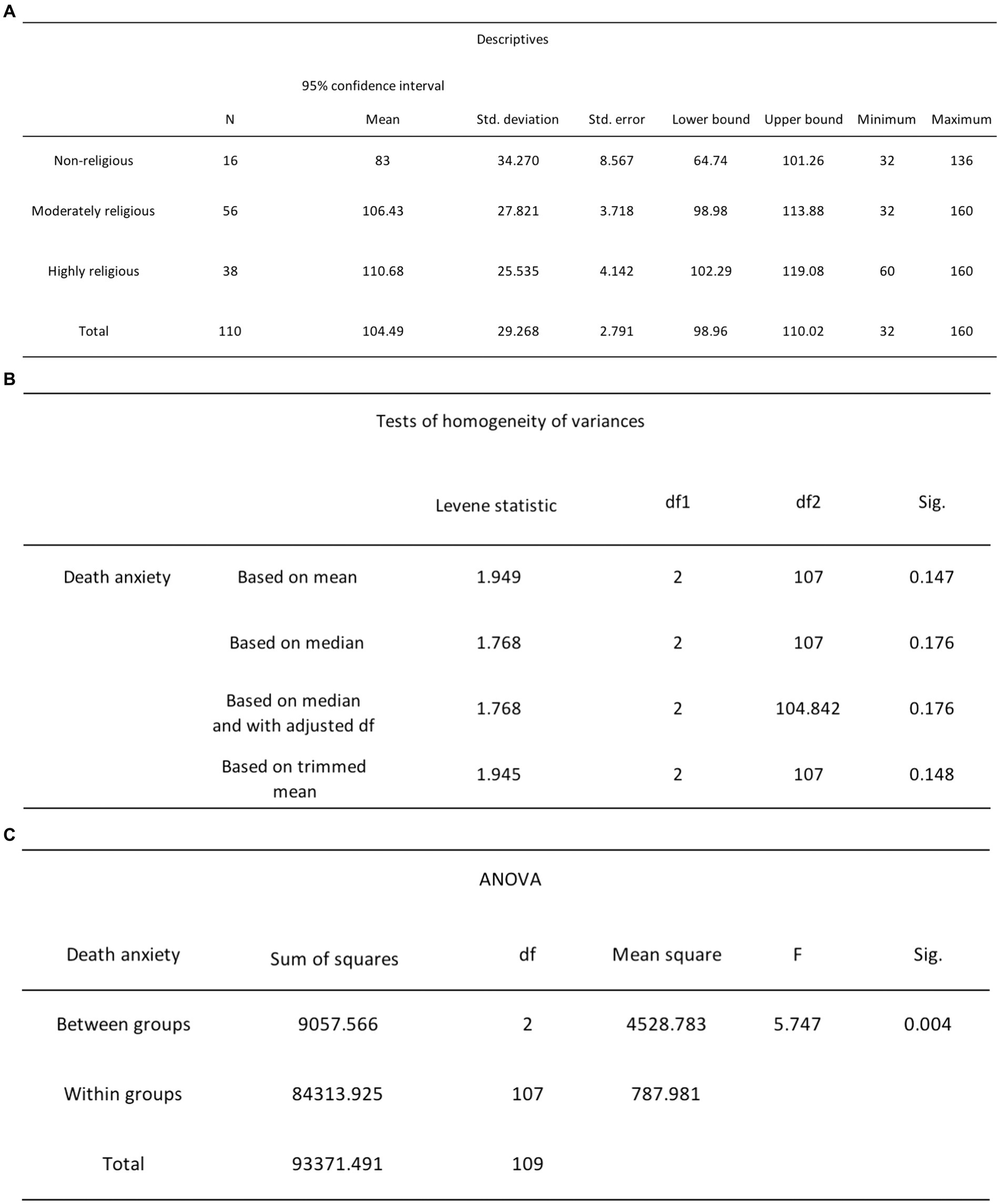Figure 7. (A) One-way ANOVA descriptive statistics for DA and religiosity. (B) One-way ANOVA Levene’s test results for DA and religiosity. (C) One-way ANOVA test results for DA and religiosity.