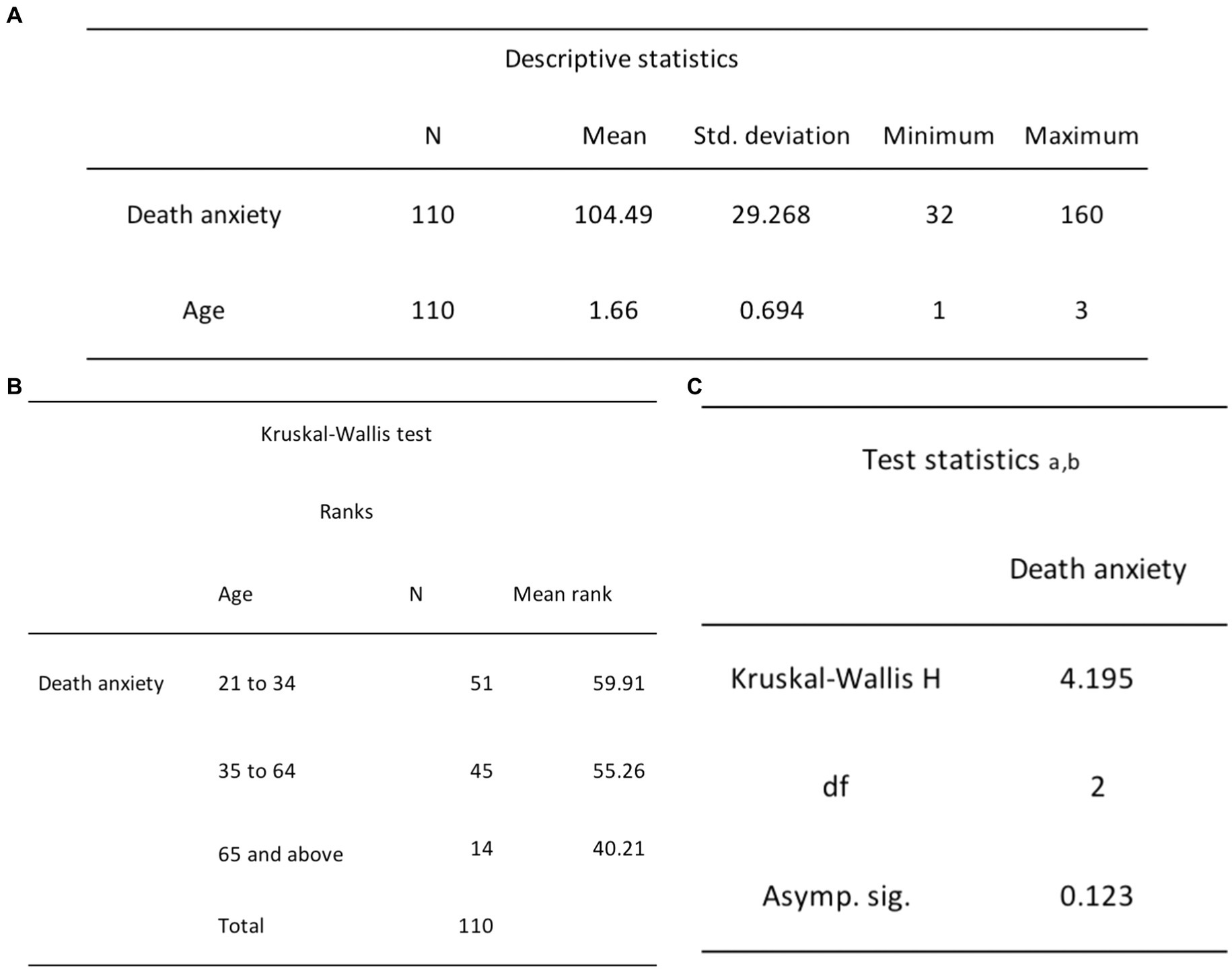 Figure 9. (A) Independent-samples Kruskal-Wallis descriptive statistics for DA and age. (B) Independent-samples Kruskal-Wallis ranks test results for DA and age. (C) Independent-samples Kruskal-Wallis test statistics for DA and age.