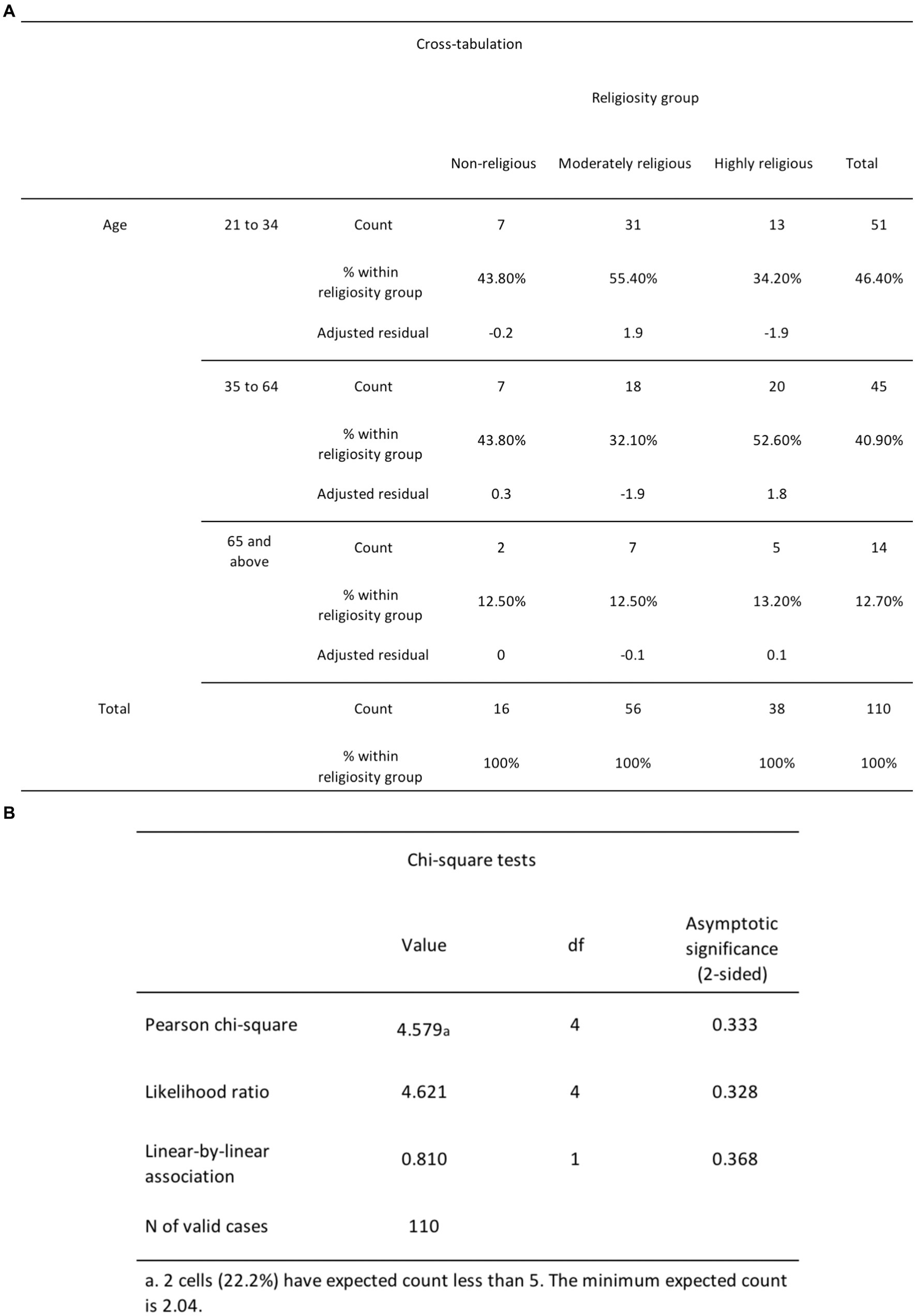 Figure 10. (A) The chi-square cross-tabulation test results for religiosity and age. (B) The chi-square test results for religiosity and age.