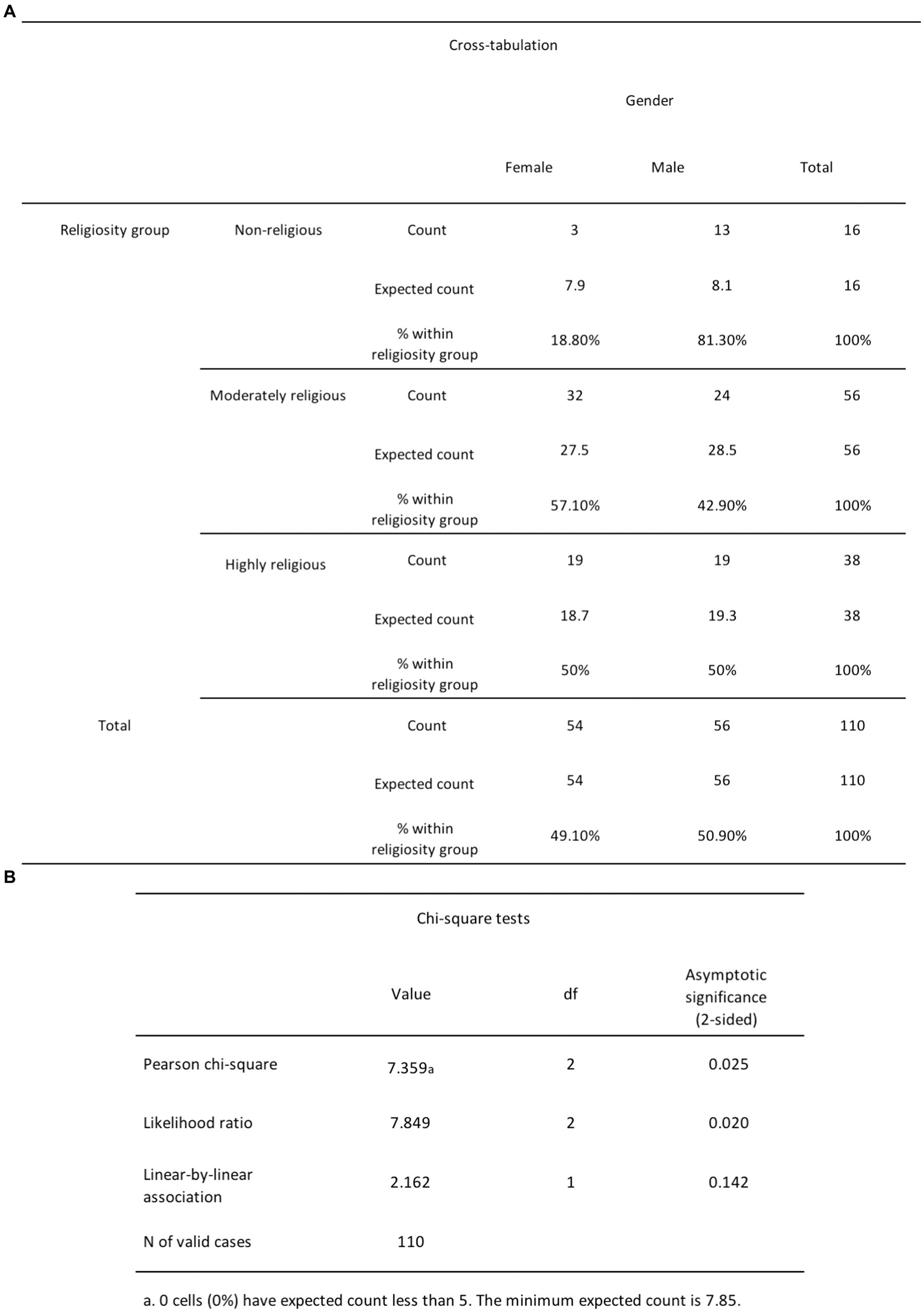 Figure 11. (A) The chi-square cross-tabulation test results for religiosity and gender. (B) The chi-square test results for religiosity and gender.