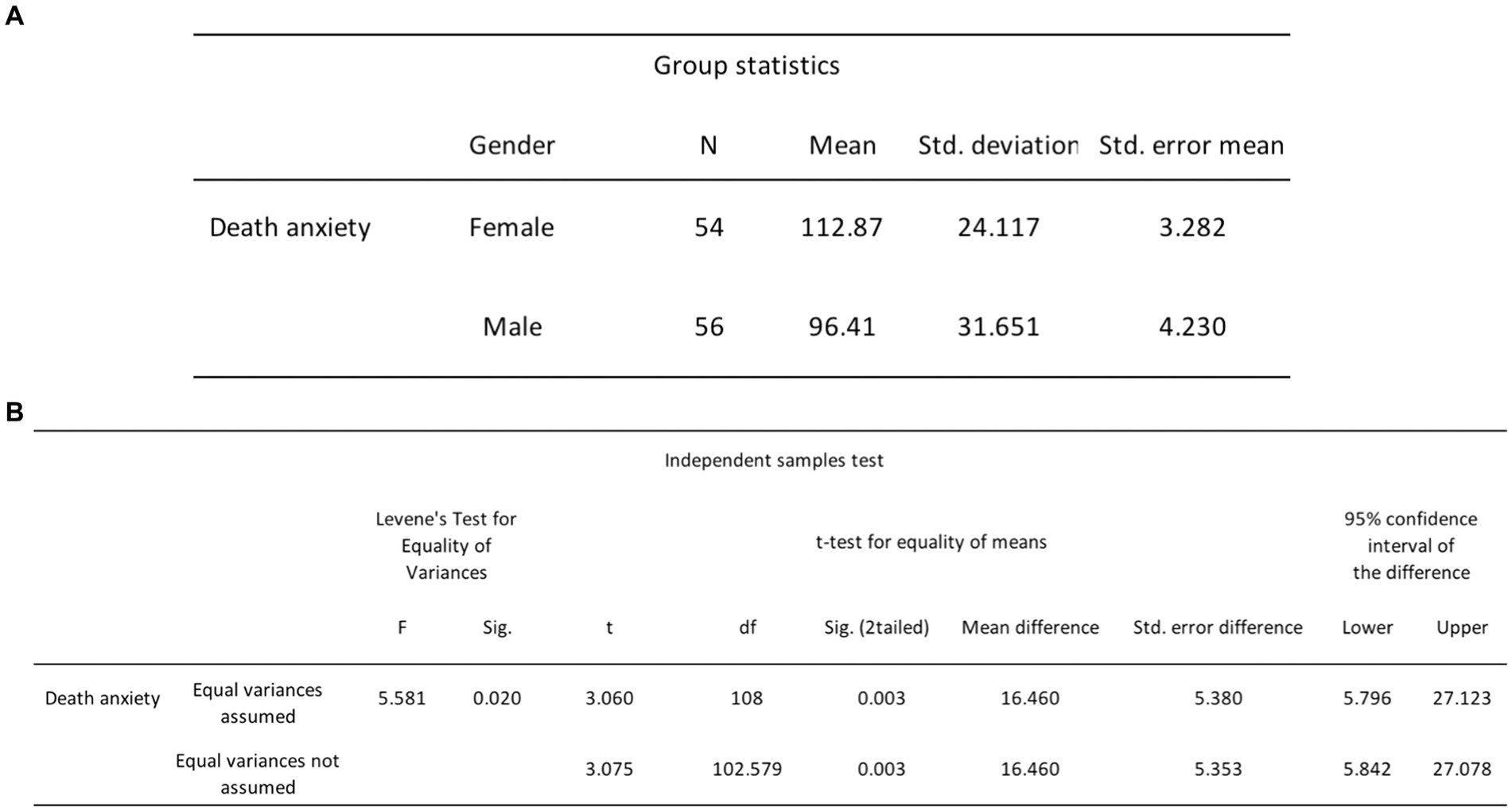 Figure 12. (A) Independent samples t-tests group statistics for DA and gender. (B) Independent samples t-tests results for DA and gender.