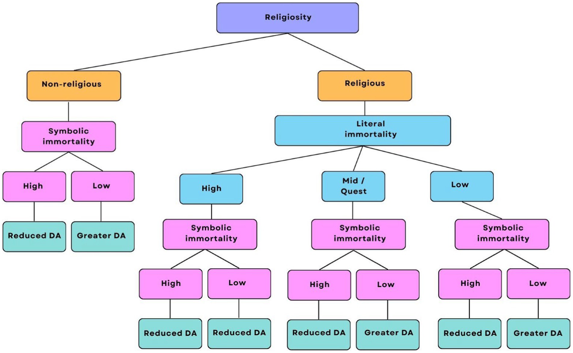H1: There will be a significant difference in mean DA scores across levels of religiosity, such that individuals who are highly religious or non-religious will report lower levels of DA compared to those who are moderately religious.