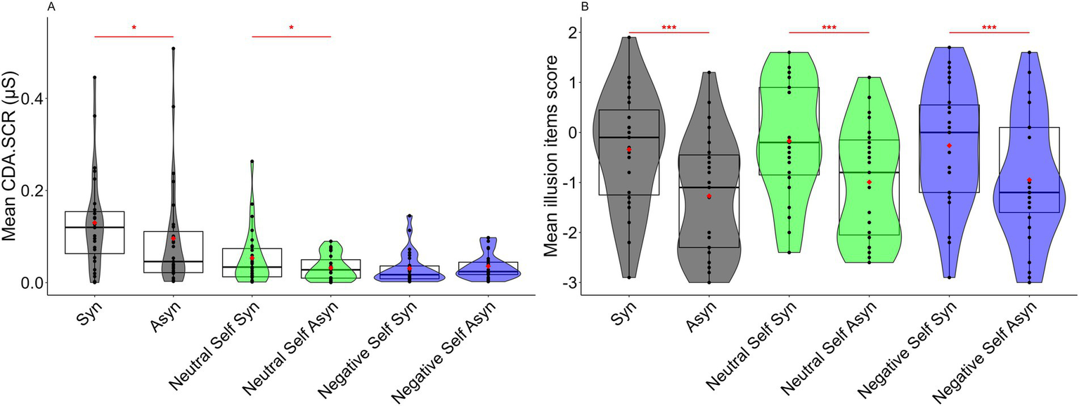 (A) Mean CDA.SCR for the synchronous and asynchronous conditions for each top-down body association condition. (B) Mean illusion items score for the synchronous and asynchronous conditions for each top-down body association condition. Box-and-whisker plot displays the median, lower/higher quantile, and minimum/maximum of the individual data. Red diamonds indicate the average values (***p < 0.001, *p < 0.05). See Supplementary material for descriptive statistics for each condition.