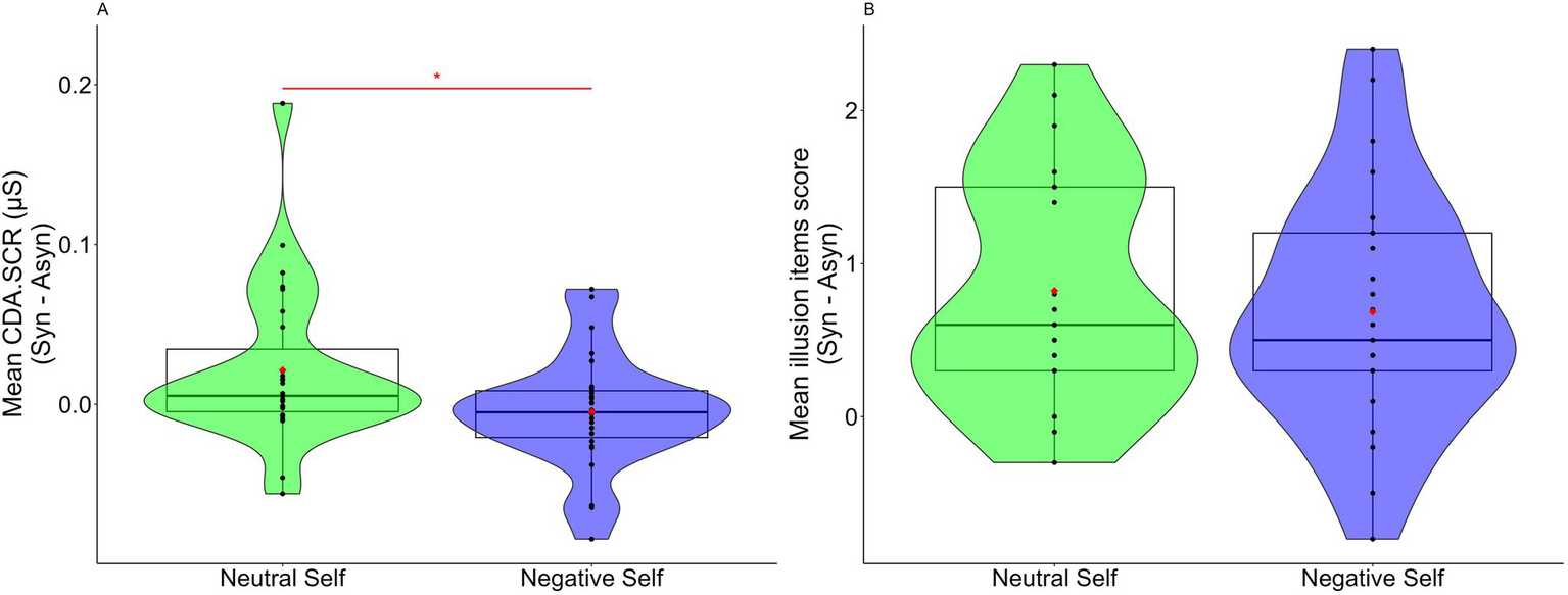 (A) Value of the difference in CDA.SCR between the synchronous and asynchronous conditions in the neutral and negative self-association conditions. (B) Value of the difference in the illusion items’ scores between the synchronous and asynchronous conditions in the neutral and negative self-association conditions. The box-and-whisker plot displays the median, lower/higher quantile, and minimum/maximum of the individual data. Red diamonds indicate the average values (*p < 0.05).