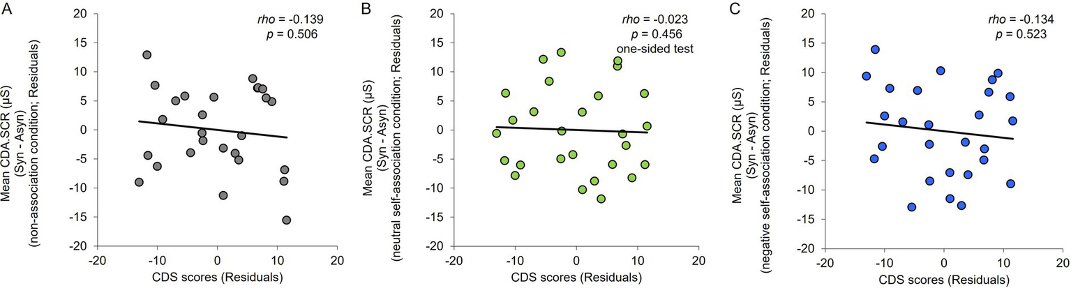 (A) Scatter plots for the CDS scores and value of the difference in CDA.SCR between the synchronous and asynchronous conditions in the non-association condition. (B) Scatter plots for the CDS scores and value of the difference in CDA.SCR between the synchronous and asynchronous conditions in the neutral self-association condition. (C) Scatter plots for the CDS scores and value of the difference in CDA.SCR between the synchronous and asynchronous conditions in the negative self-association condition. Control variables were age and overall mean of the non-association condition.