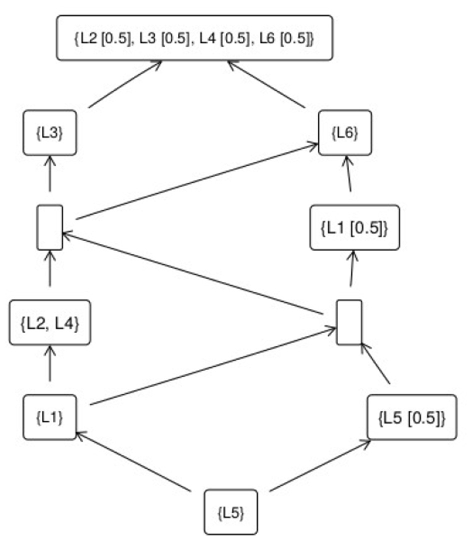 When the outcomes of educational measurement procedures are not completely and crisply dichotomous with respect to all the construct-relevant attributes about which information is collected, the concept lattice for the resulting matrix of fuzzy truth values is itself fuzzy. Objects and attributes belong to concepts with degrees of truth, rather than crisply. In the concept lattice in Figure 2, the label “0.5” after a learner-identifier means that learner belongs to the concept (i.e., has demonstrated that type or level of performance) to degree ).
