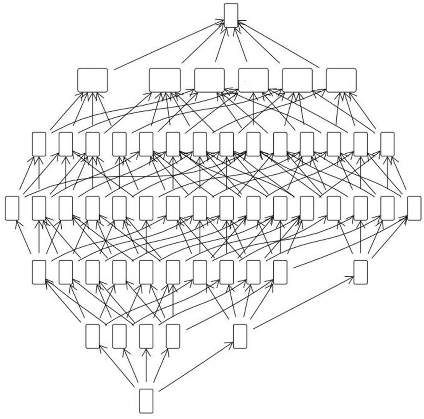 The collection of all formal concepts extracted from a matrix or data table simply restates the information present by virtue of the way the data is structured due to the choice of attributes (test item responses, in this example), and the ordered valuations chosen for attributes (just the two categories 1 ≥ 0 in this case). However, it makes this structure more apparent (and graphically representable, as in Figure 1) because concepts are (partially) ordered via the set-theoretic notion of inclusion. A concept (L1, I1) is more general than a concept (L2, I2) if L1⊇L2 (or equivalently, if I1⊆I2). The most general concept is the one that has the largest extent (and smallest intent). In test performance terms, the most general concept corresponds to the bottom, or worst, performance: because every other performance has a larger intent (entails more correct items). Similarly, the least general concept (with the smallest extent and largest intent) corresponds to the top, or best, level of performance.7