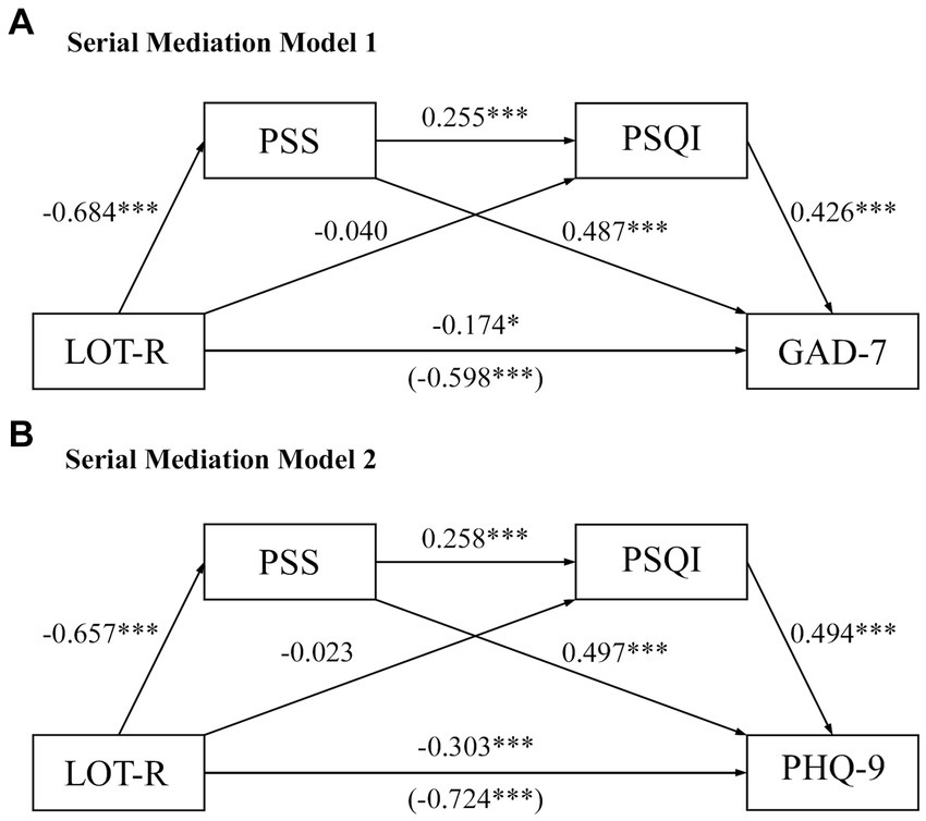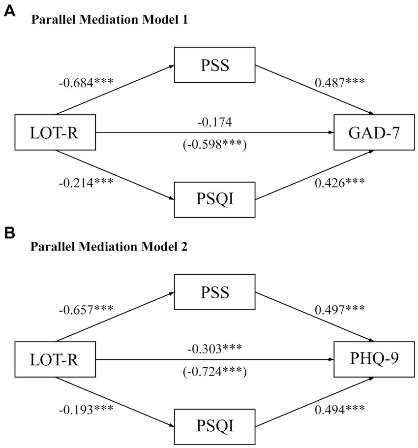 The study found that optimism influences anxiety and depression through both direct and indirect pathways. In line with predictions, the parallel mediation analysis revealed that the impact of optimism on anxiety (βtotal = −0.598, 95% confident interval [CI]: −0.778 to −0.392) and depression (βtotal = −0.724, 95% CI: −0.919 to −0.519) was mediated by stress and sleep quality. Furthermore, the serial mediation models revealed that stress and sleep quality co-mediated the relationship betweenoptimism and anxiety (indirect effect [IE] = −0.074, 95% CI: −0.135 to −0.029) or depression (IE = −0.084, 95% CI: −0.142 to −0.036) in a sequential manner.