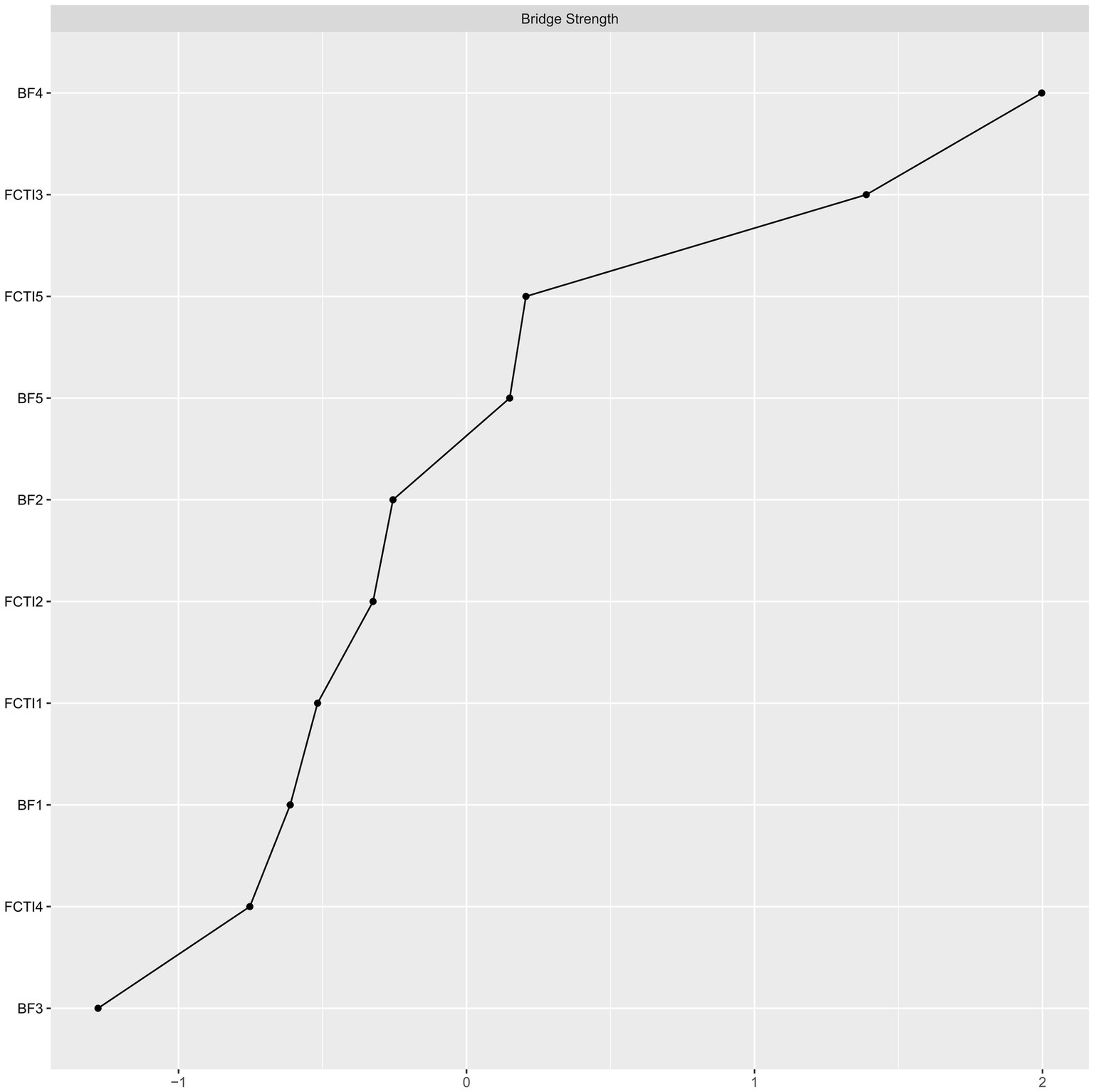 According to the estimation method for sample size in network analysis (Epskamp et al., 2018), at least P(P-1)/2 parameters are required when there are P nodes in the network. Following the standard of having at least 3–5 individuals per parameter to ensure the statistical power of the network analysis, a minimum sample size of 135–225 individuals would be needed. In the network analysis of this study, there are 10 dimensions in the BF scale and FCTI, with each dimension representing one node. This requires the estimation of 45 parameters (10*9/2). With a final sample size of 272 participants included in this study, it is sufficient to conduct the network analysis.