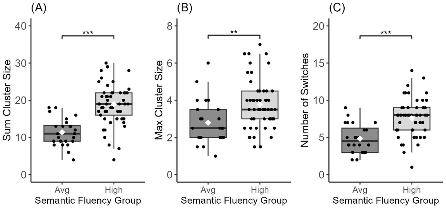 In between-group analyses, we found a significant main effect of group on sum cluster size [F(1,75) = 37.05, p < 0.001], max cluster size [F(1,75) = 9.62, p = 0.003], and number of switches [F(1,75) = 22.54, p < 0.001]. Post-hoc analyses via Tukey’s HSD test revealed higher sum cluster size and max cluster size as well as a higher number of switches for the high semantic group relative to the average semantic group on all three fluency variables (all p-values <0.05; see Figure 2 and Table 2). These group differences persisted after using a ratio (by dividing each score by the total number of words produced) for sum cluster size [F(1,75) = 6.323, p = 0.014] but not for number of switches [F(1,75) = 1.851, p = 0.177; Table 2].
