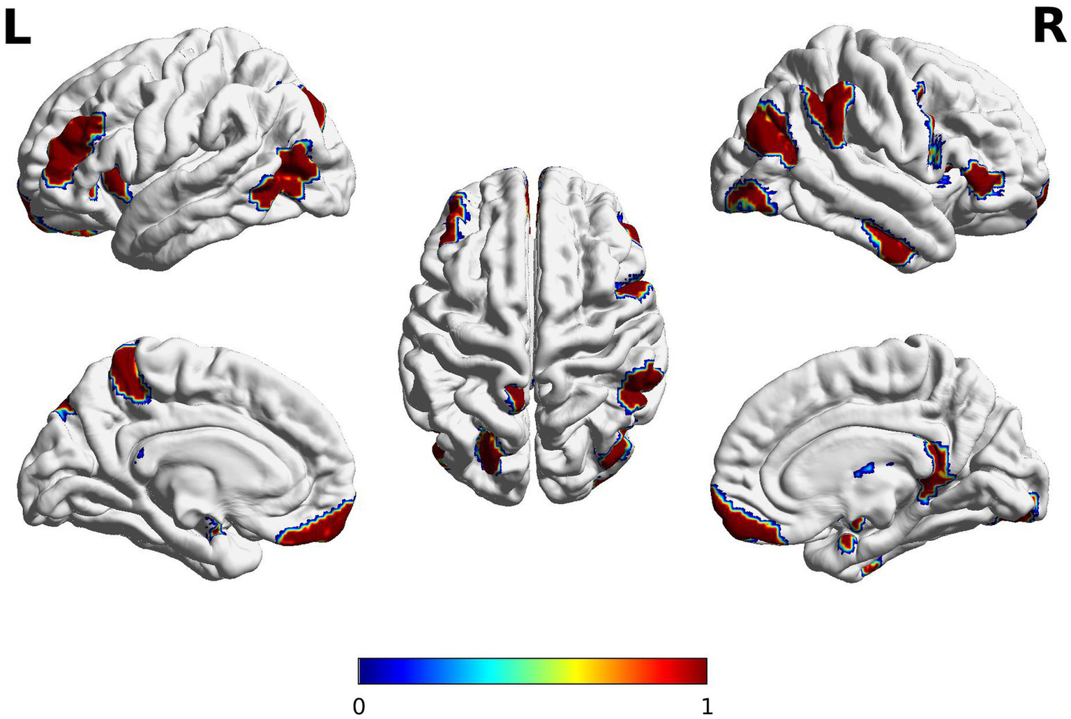 The pre-processed rs-fMRI data were analyzed using a time-varying dynamic network approach (Jiang et al., 2022; Jin et al., 2023), a technique that measures changes in brain network connections over time. It has two components: a temporal component (given by the number of state transitions and their dwell times), which describes how brain states change over time (dynamic), and a spatial component (given by the number of eigenmodes), which represents the static connections between brain regions. The model separates these components and uses piece-wise constant multivariate signal generation described in detail in Jiang et al. (2022) and Jin et al. (2023). The brain regions were anatomically localized using the Brainnetome Atlas (https://atlas.brainnetome.org; Fan et al., 2016). We followed the method of Jin et al. (2023) and extracted the spatial features of whole-brain rs-fMRI connectivity (all 246 brain regions of interest). We applied time-varying dynamic network analysis to data from each participant, generating spatial results where the model produces a 246-length spatial feature vector, with each value corresponding to a region of interest (ROI). To assess differences between the two groups, we performed a t-test on each of the 246 spatial features. We then identified the brain regions that had significantly different spatial features between the high and average semantic fluency groups. To account for multiple comparisons, we apply Bonferroni correction, considering an ROI significant if the p-value from the t-test is less than 0.05/246. Thus, all results were peak-level and cluster-level corrected (pFWE < 0.05) for multiple comparisons in the whole-brain analysis.