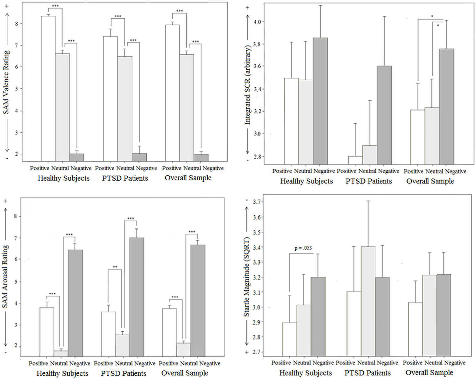 Figure 2. Manipulation check: Subjective (Subjective Assessment Manikin SAM for valence and arousal) and objective (Skin conductance response SCR and Startle reflex magnitude) effects for groups (PTSD and controls), total sample related to different emotional script qualities in intertrial intervals without stimulation.