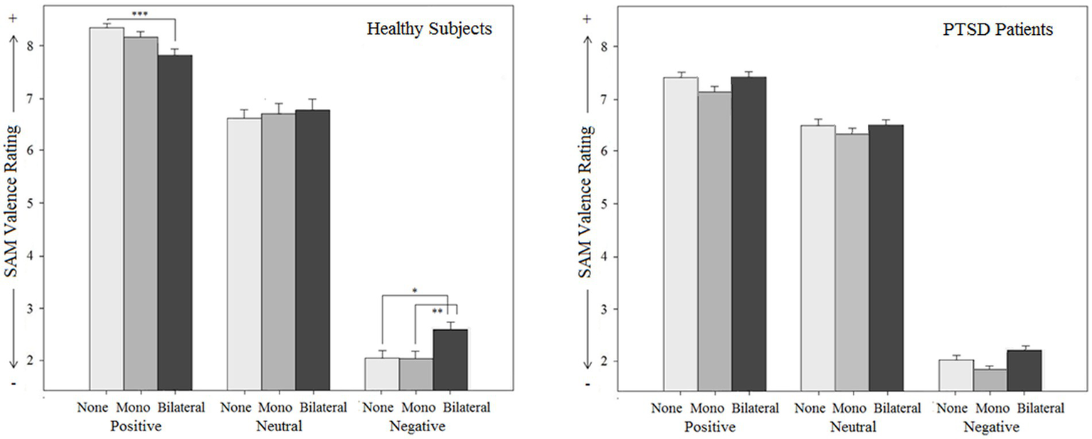 For the SAM arousal score (reaching from 1, low arousal, to 9, high arousal), a significant script category x stimulation type interaction effect (p < 0.001) was observed in the overall sample: Post hoc tests showed that bilateral stimulation decreased subjective arousal exclusively for negative scripts (MDbi vs. none = −1.11, p = 0.000, 95% CI [−1.64,-0.58]). For positive scripts, a reversed effect was detected with a significantly larger subjective arousal under bilateral stimulation compared to no stimulation [MDbi vs. none = 0.58, p = 0.001, 95% CI (0.22, 0.94)]. The assessment of neutral scripts was not influenced [MDbi vs. none = 0.19, p = 0.072, 95% CI (−0.01, 0.38)]. Bilateral stimulation thus decreased arousal for negative content and increased arousal for positive content. Monolateral stimulation had no effect on arousal during negative [MDmono vs. none = 0.01, p = 1.000, 95% CI (−0.52, 0.54)] and positive scripts [MDmono vs. none = −0.03, p = 1.000, 95% CI (−0.60, 0.53)], but increased arousal for neutral scripts [MDmono vs. none = 0.30, p = 0.009, 95% CI (0.06,0.55)]. This interaction effect was significant both in the patient sample (p < 0.001) and the control sample (p < 0.000). The script category x stimulation type x group interaction effect was not significant (p = 0.559), i.e., stimulation effect did not differ between the groups. The main effect for stimulation type (p = 0.202), the stimulation type x group interaction effect (p = 0.660), and the main effect for group (p = 0.111) were also not significant.