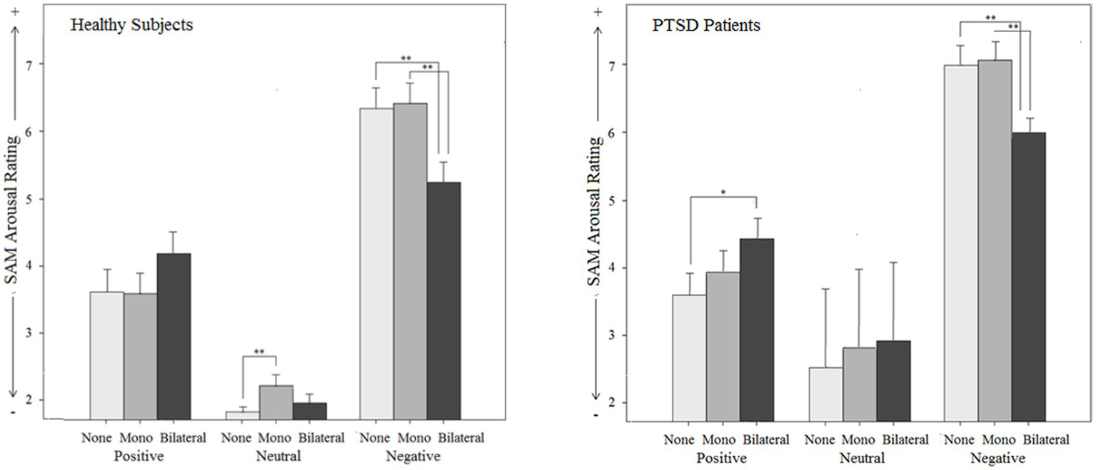 Figure 4. Subjective effects on arousal (Subjective Assessment Manikin SAM) by different types of stimulation (mono-, bilateral, no stimulation) for both groups (PTSD and controls) in relation to different emotional script qualities.