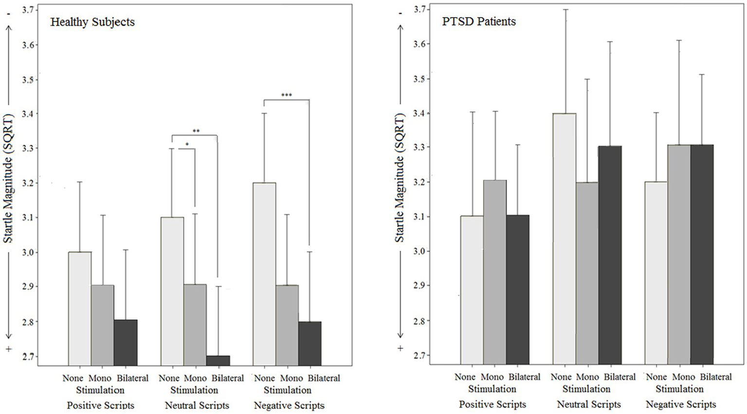 Figure 5. Objective effects on Startle reflex magnitude by different types of stimulation (mono-, bilateral, no stimulation) for both groups (PTSD and controls) in relation to different emotional script qualities.