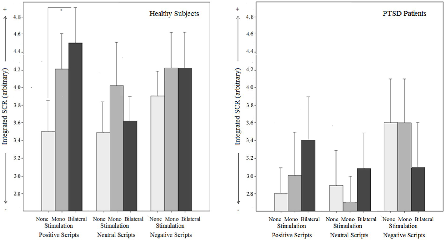 Figure 6. Objective effects on Skin conductance response (SCR) by different types of stimulation (mono-, bilateral, no stimulation) for both groups (PTSD and controls) in relation to different emotional script qualities.