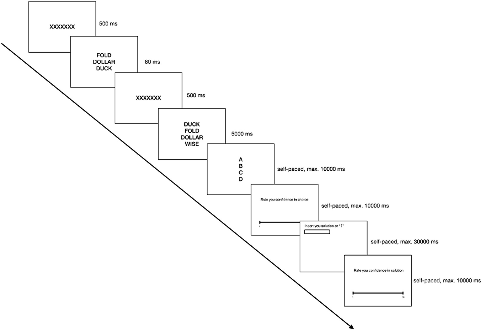 After informed consent and detailed instructions, participants were shown 60 tetrad trials, each displaying four words for 5 s. These trials were divided into 20 solvable tetrads with solution word primes, 20 solvable tetrads with nonword primes, and 20 unsolvable tetrads with nonword primes. The unsolvable tetrads served as filler trials. Primes were masked and briefly presented for 80 milliseconds before each tetrad. Tetrads were randomly selected from a stimuli pool and presented randomly to each participant.