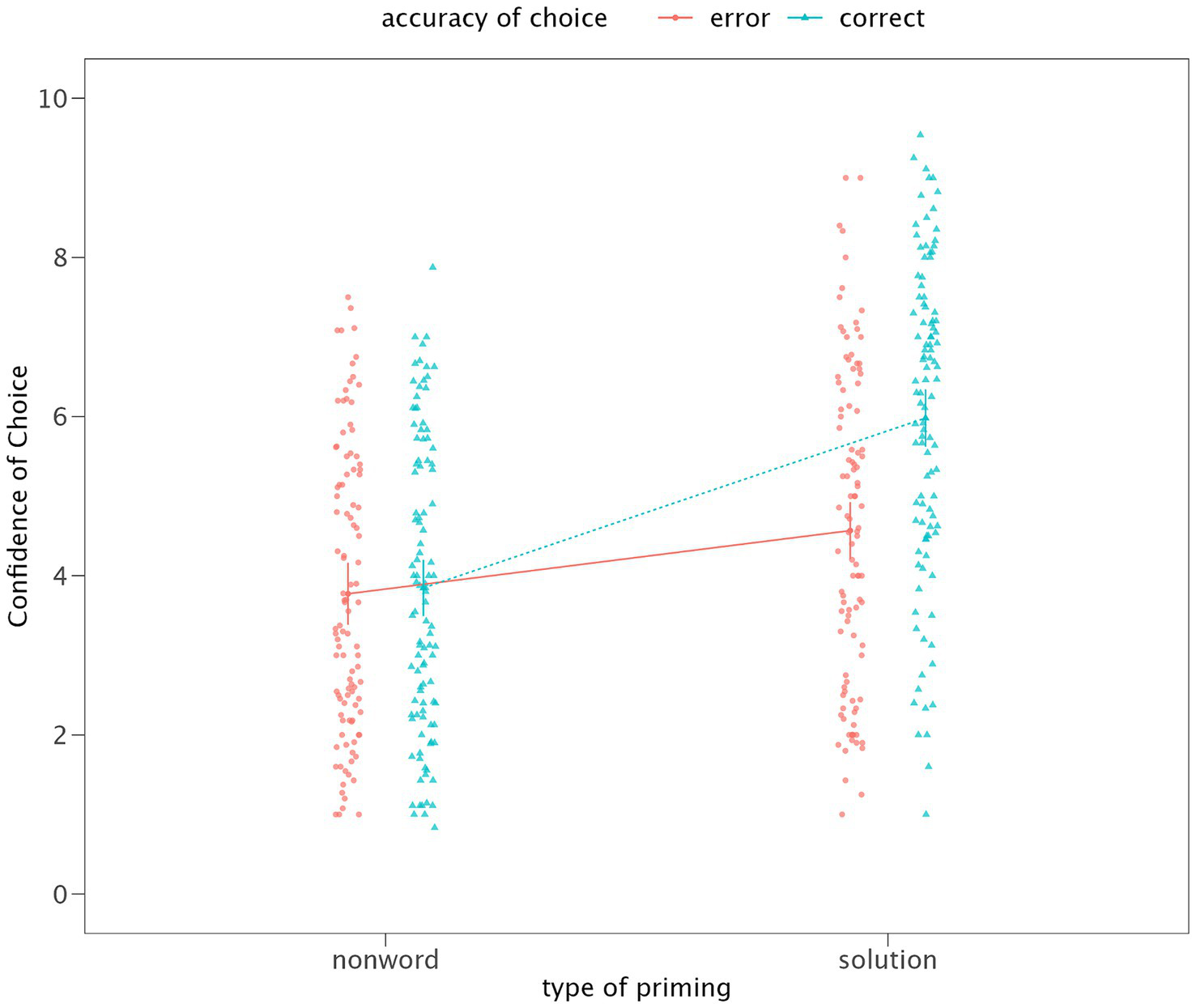 Mean confidence in intuitive choices depending on the type of priming and choice accuracy. Whiskers represent 95% CI.