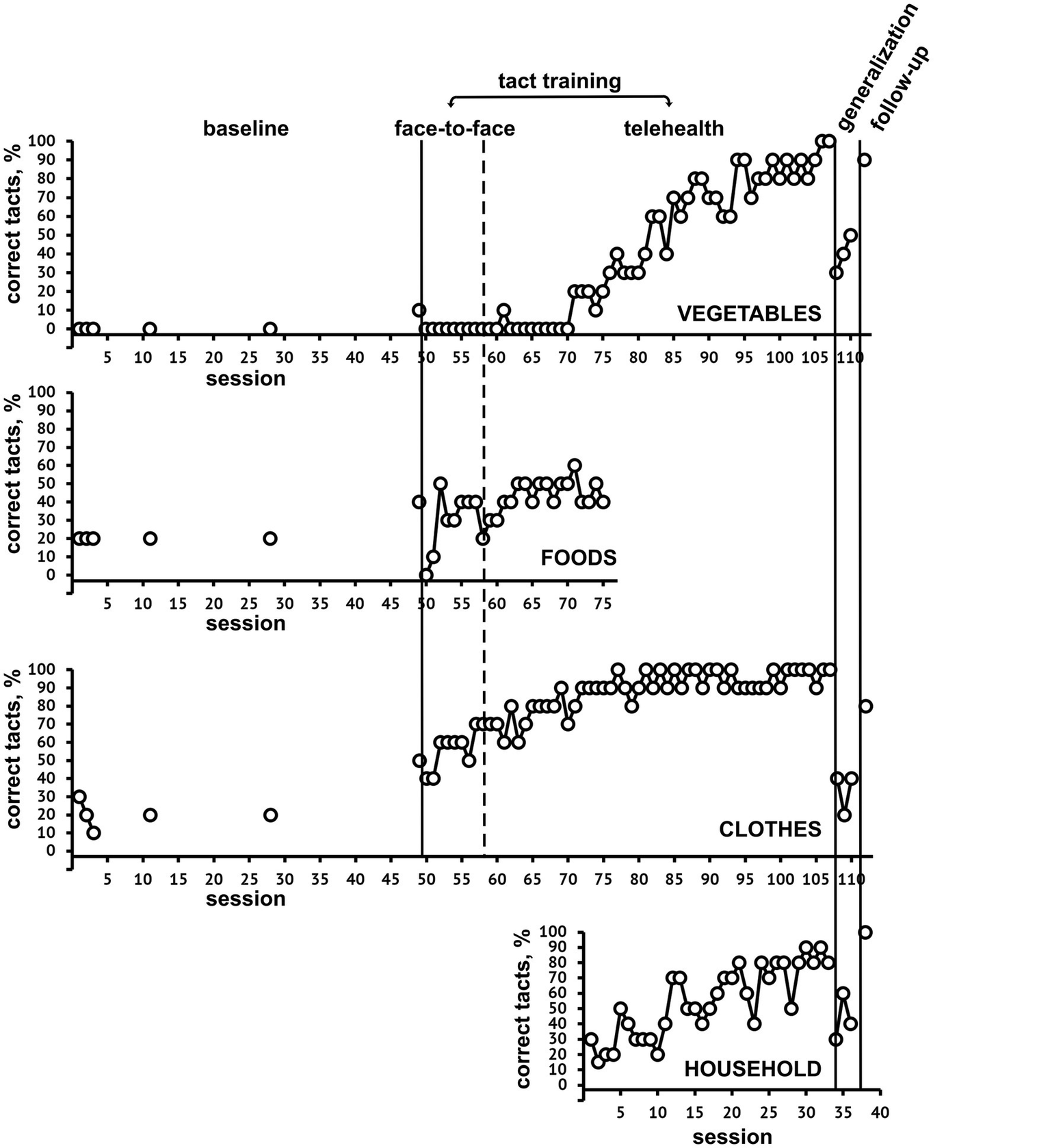 For both, SET 1 and SET 2, the mastery criterion (80% correct stimulus tacts, for three consecutive times, simultaneously for all categories) was achieved. No increased percentage of correct picture tacts was found for untrained items. At follow-up, the patient provided 70 to 100% correct responses. For both SET 1 and SET 2, telehealth did not modify the correct response trends.