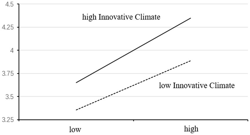 An innovative climate fosters a social environment rich in opportunities for innovation and learning. In such an environment, individuals can observe the craftsmanship spirit, knowledge sharing, and innovative behaviors of others. Also, they can transform these observations into their own behaviors and attitudes through observational learning. The knowledge-sharing and innovative behaviors of individuals may be encouraged, recognized, and rewarded in an organizational environment with an innovative climate. Such support and encouragement can significantly enhance the innovation self-efficacy of individuals, which is the belief in their ability to implement innovative actions. This self-efficacy is conducive to the more effective transformation of craftsmanship spirit into actual innovative behavior and increases the likelihood of individuals engaging in knowledge sharing to drive innovation. Positive social support and team interactions within the innovative climate can facilitate knowledge sharing, cooperation, and collaborative innovation, creating a more favorable environment for effectively transforming craftsmanship spirit into innovative behavior.
