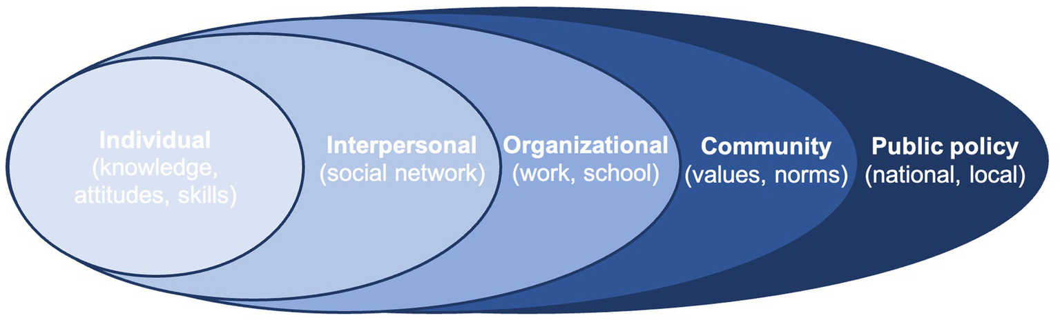 A diagram to show the five systems levels of the socioecological framework.