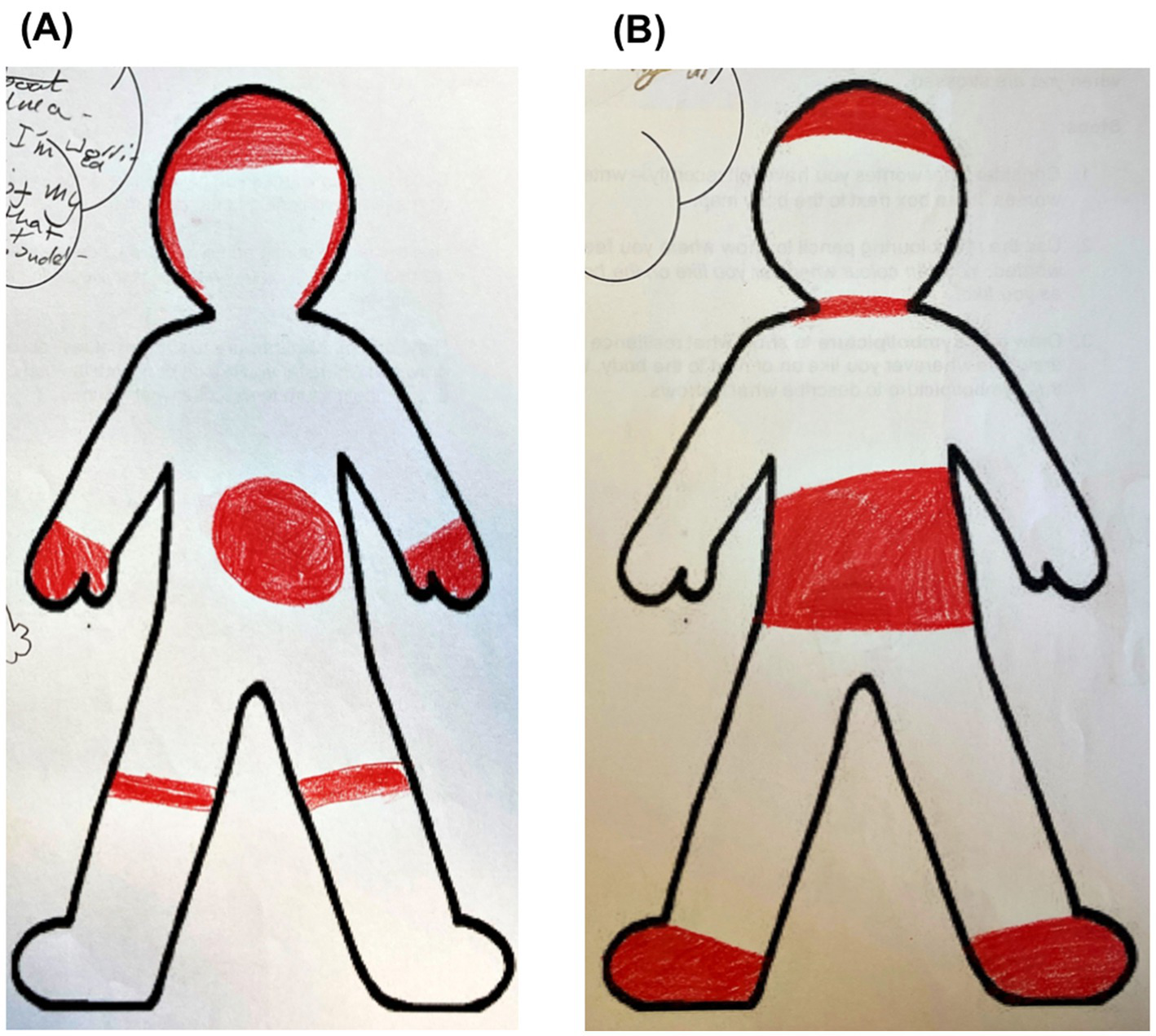 (A,B) Examples of children’s coloring of their somatic experiences of stress.