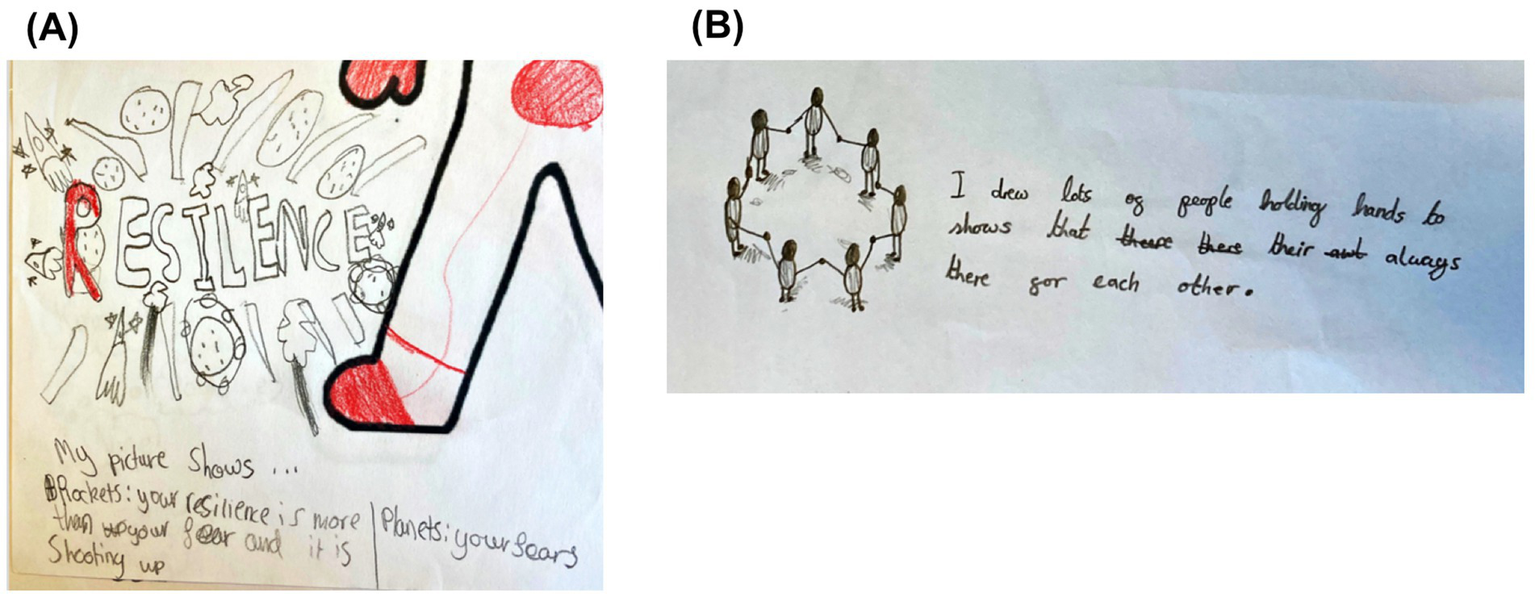 Qualitative inquiry accounts for context and local definitions of positive outcomes (Ungar, 2003). Arts-based research (ABR) is a form of qualitative inquiry which uses symbolism, metaphor and artistic processes to explore subjective human experiences (Wimpenny and Savin-Baden, 2014). Given that children learn to use verbal language progressively, visual ABR methods use art to go “beyond logical verbal language to come to an understanding of voice” (Caldairou-Bessette et al., 2020, p. 3) which includes non-verbal expression (Teachman and Gibson, 2018). ABR also offers a palatable, non-stigmatising means of engaging with sensitive topics (Hickey-Moody et al., 2021), making it suitable for research with CYP. For example, in their systematic review of using ABR methods with young people with complex psychosocial needs, Nathan et al. (2023) found that these methods drew out young people’s strengths, resilience and optimism and enabled meaningful exploration of experiences.