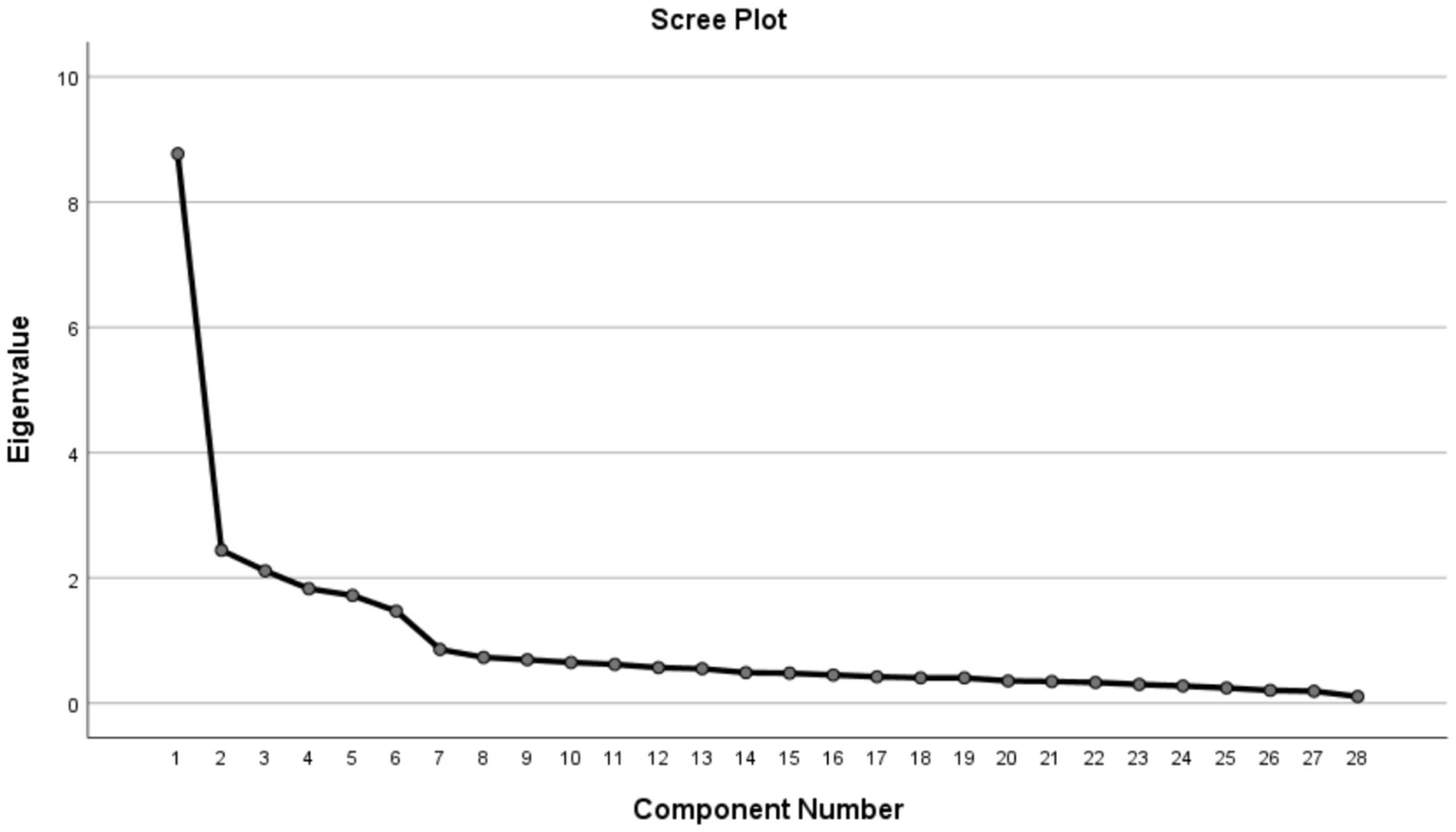 Before conducting exploratory factor analysis to confirm the construct validity of the Children’s Happiness Scale, we assessed whether the collected data were suitable for factor analysis by performing the Kaiser-Meyer-Olkin (KMO) measure of sampling adequacy and Bartlett’s test of sphericity. A KMO value closer to 1 indicates high inter-correlation among the factors, with values above 0.70 indicating suitability for factor analysis and higher validity. Bartlett’s test assesses whether the observed variables intercorrelate significantly, with a significance level below 0.05 indicating that the data are suitable for factor analysis. The KMO value was 0.89, and Bartlett’s test of sphericity yielded a statistically significant result of 3898.48 (df = 378, p < 0.001). Thus, the collected data are suitable for factor analysis, indicating the presence of common factors.
