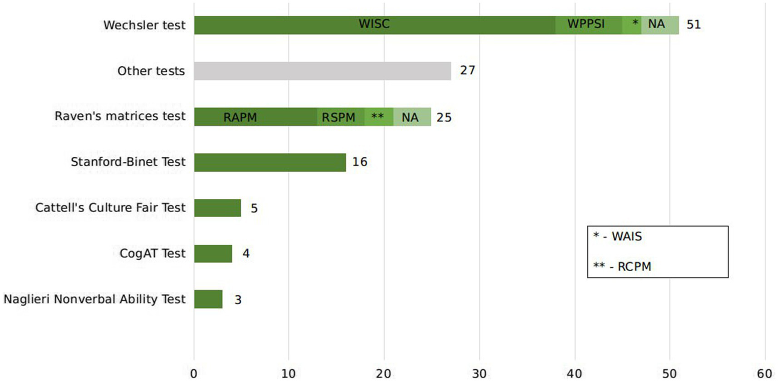 Figure 2 illustrates the distributions of different tests used to select gifted and control groups in eligible articles. The Wechsler Intelligence Scale was the most popular test used (n = 51). Subscales of the Wechsler Intelligence Scale Test were specified, where possible. Second most popular test among eligible papers was the Raven’s Matrices Test (n = 25). Stanford-Binet was used 16 times, Cattell’s Culture Fair Test—five, CogAT—four and Naglieri Nonverbal Ability Test—three. Other tests (n = 27) were used in less than three articles and composed the category “Other tests.”