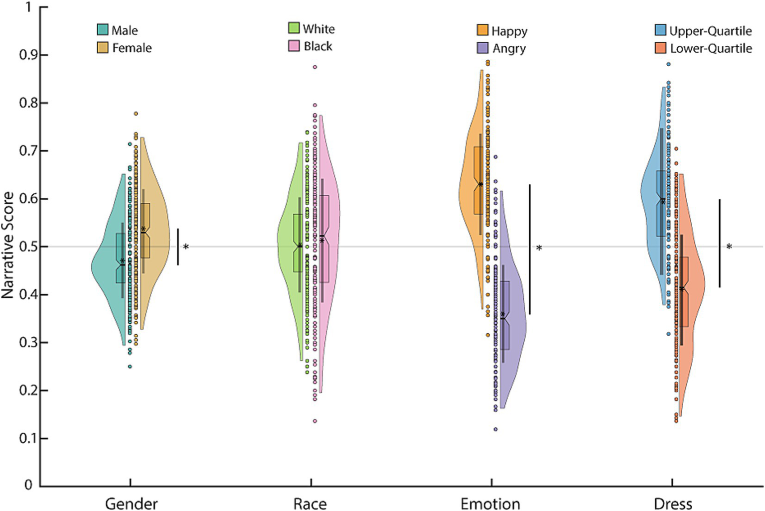 Figure 2. Narrative scores for each characteristic, grouped by characteristic category. Each circle is the mean narrative score of a participant; the boxplot shows the median, interquartile range, and the 95% confidence interval for the median. The asterisk in the boxplot denotes the mean and the line the mean ± 1 standard deviation. The distribution is a kernel density. Asterisks on the bar denote significant differences using an independent samples t-test, p < 0.05.