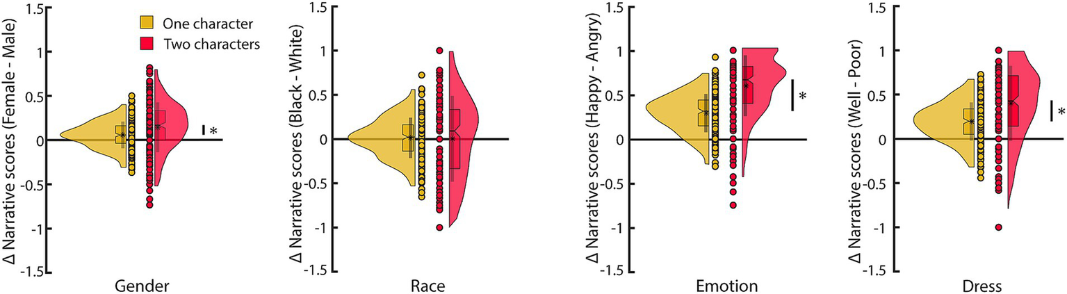 Figure 4. Social contrast effect in the difference in narrative scores when there was one character vs. two characters for each characteristic category. The Y-axis is the difference in narrative scores between the preferred and the non-preferred characteristics in each attribute category. Data in ocher shows the difference between the responses for the preferred vs. the least preferred characteristic when the narrative has only one character per participant. Data in red shows the difference between the average response when the narrative contains two characters. Each circle is a participant’s average narrative score; the boxplot shows the median, interquartile range, and the 95% confidence interval for the median. The asterisk in the boxplot denotes the mean and the line the mean ± 1 standard deviation. The distribution is a kernel density. The lines with an asterisk illustrate a significant difference (independent samples t-test, p < 0.05). n = 255 participants for each plot.