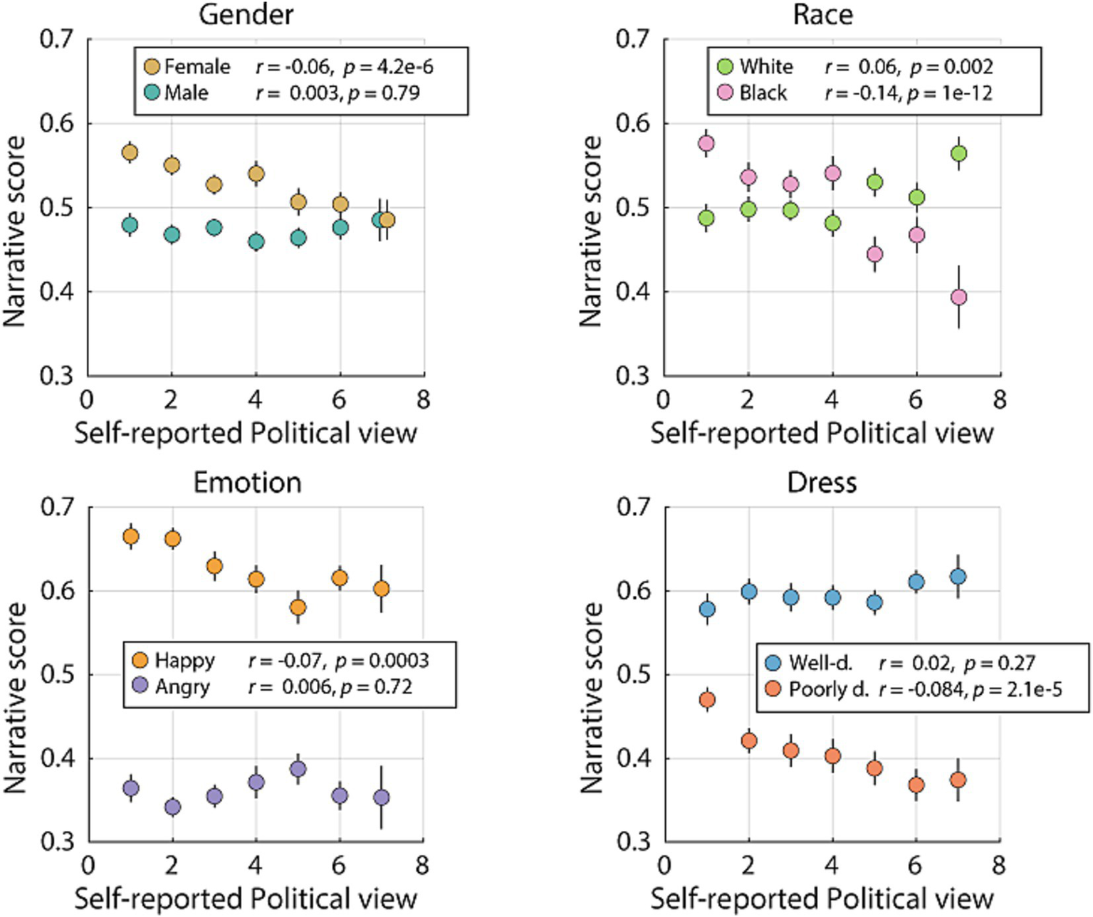 Figure 5. Relationship between political view and each characteristic. Scatter plot with means and SEM of the narrative score for each characteristic parsed by respondents’ self-reported political leaning, with higher numbers indicating being more conservative. n = [39, 56, 45, 36, 34, 30, 15], per level of self-reported political view. Partial correlations and associated p-values are included for each characteristic.