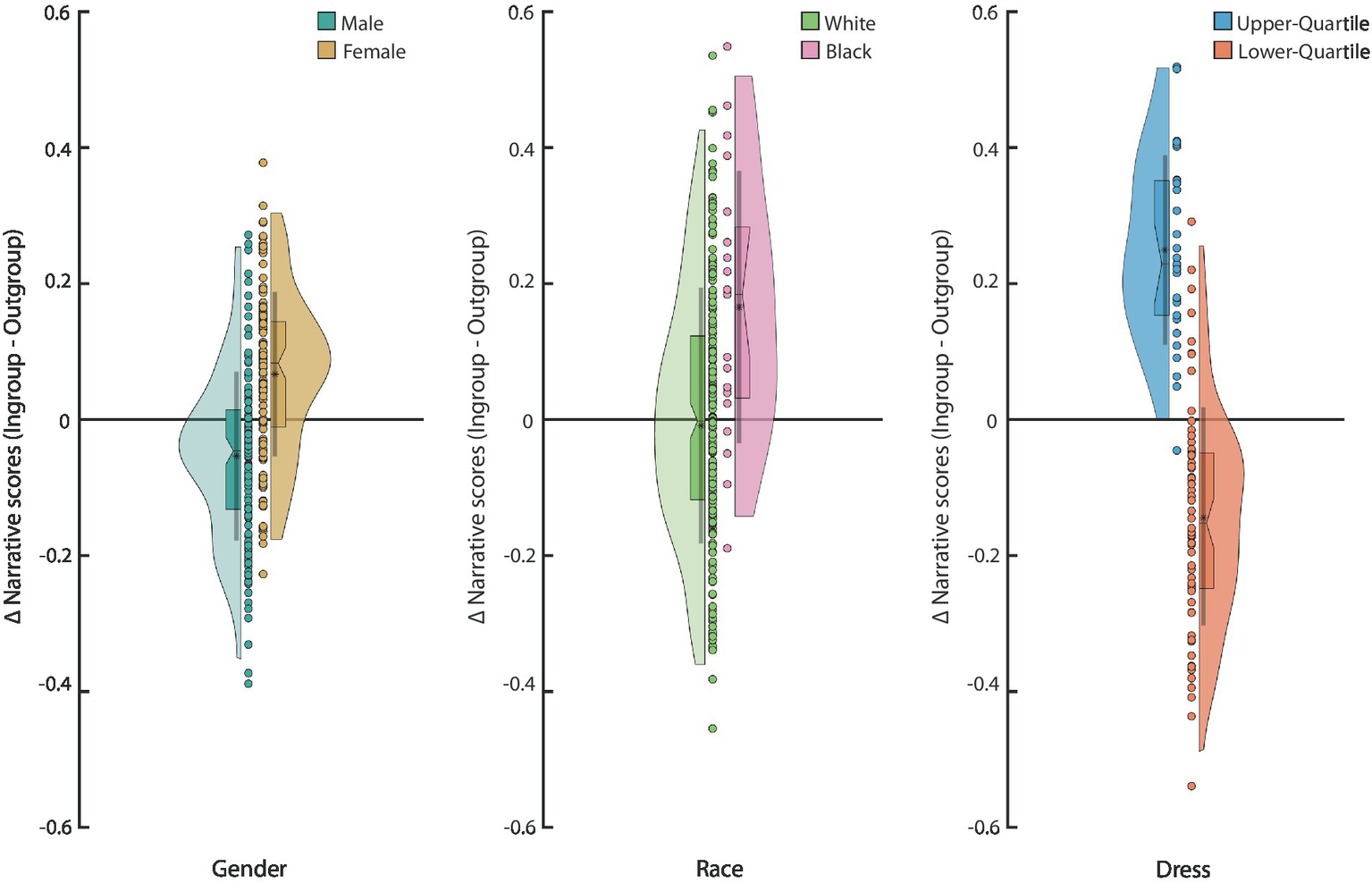 Figure 6. Ingroup favoritism is illustrated by the difference in narrative scores when the respondent could have considered the narrative characters as ingroup or outgroup based on their self-reported demographics. The Y-axis is the difference in narrative scores between the ingroup and outgroup for each demographic dimension: Male: n = 138, Female: n = 114; White: n = 210, Black: n = 19; Upper-income Quartile: n = 29; Lower-income Quartile: n = 74. The boxplot shows the median, interquartile range, and the 95% confidence interval for the median. The asterisk in the boxplot denotes the mean and the line the mean ± 1 standard deviation. The distribution is a kernel density.