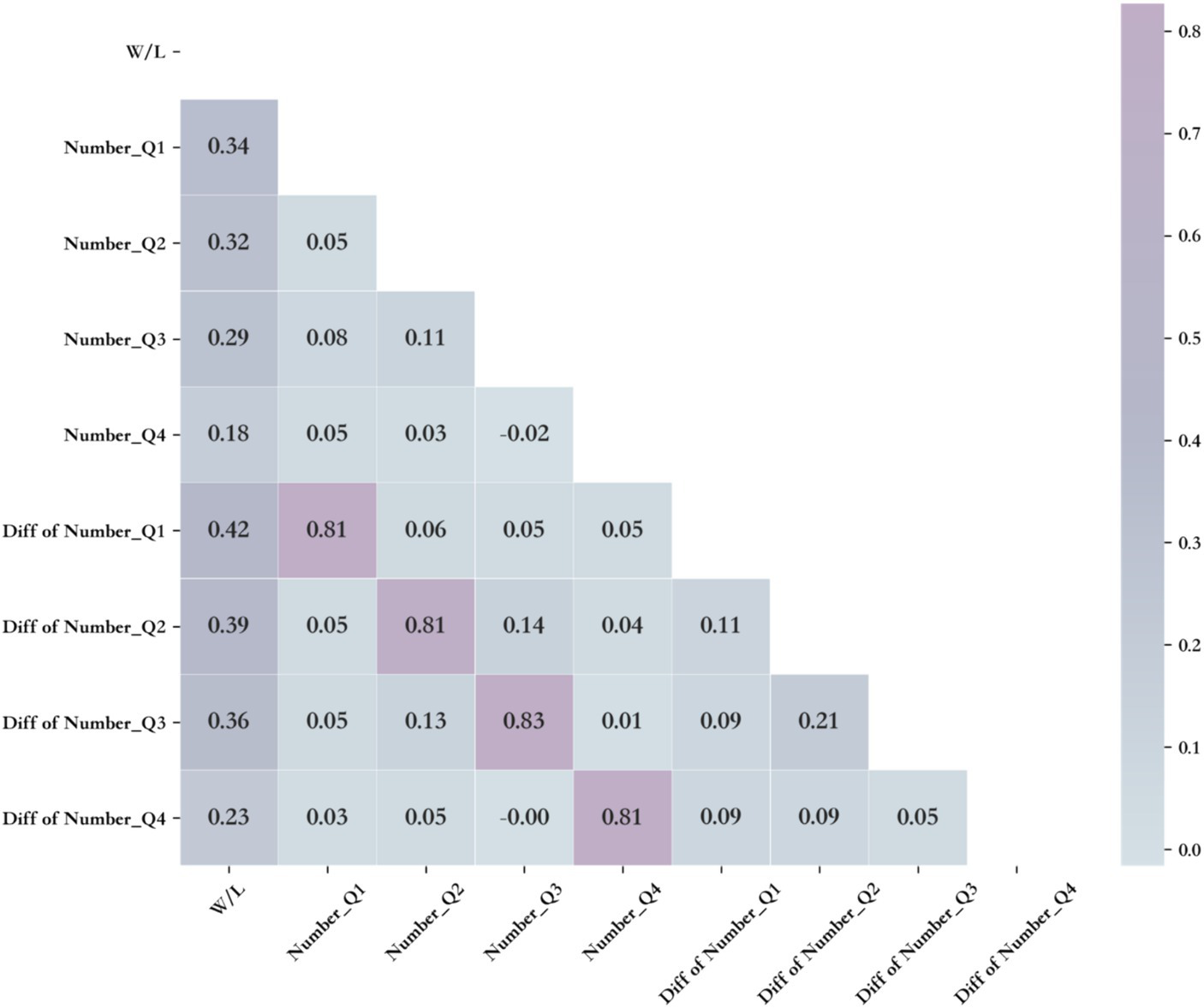 The number of momentum situations and their difference values in the four quarters were used as feature variables. Spearman’s correlation coefficient was used to analyze the correlation between the features and the game outcomes. A correlation coefficient matrix was created and a heatmap was plotted (Figure 3). The correlation between the number and difference values of momentum in each quarter and the game outcome showed a decreasing trend, indicating that the momentum in the first quarter had the greatest impact on the game outcome.