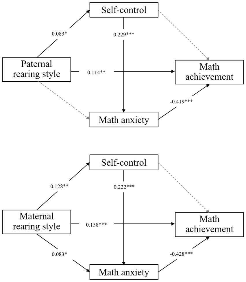 To investigate the relationship between the three dimensions of rearing style and adolescents’ self-control, math anxiety, and math achievement, we explored these connections from both the perspective of fathers and mothers. The results show that there are both similarities and differences between the three dimensions of paternal and maternal rearing styles and adolescents’ self-control, math anxiety, and math achievement (Table 4). Specifically, paternal emotional warmth positively predicted adolescents’ self-control, while maternal emotional warmth negatively predicted adolescents’ self-control. Only paternal overprotection positively predicted adolescents’ math achievement, while both maternal rejection and overprotection positively predicted adolescents’ math achievement. The similarity is that both paternal and maternal rejection and overprotection positively predicted adolescents’ self-control. Both paternal and maternal emotional warmth negatively predicted adolescents’ math anxiety, but they had no significant predictive effect on adolescents’ math achievement. Rejection and overprotection by both fathers and mothers were positive predictors of adolescents’ math anxiety. In addition, adolescents’ self-control consistently positively predicted their math anxiety, and adolescents’ math anxiety consistently negatively predicted their math achievement.