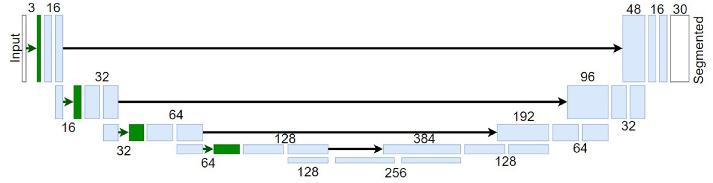In this work, we used U-Nets networks to perform image semantic segmentation following the state-of-the-art for this visual task (Ronneberger et al., 2015). See Figure 4 for an illustration of this architecture. In these networks, the input images (in digital values) go through a set of layers with progressively lower spatial resolution, i.e., the image dimensions decrease as the image passes through each block. Also, each block has a progressively higher number of features, i.e., different attributes detected by the network, such as different patterns, to capture more complex information up to the network bottleneck. From this inner representation, the signal is spatially expanded again up to the original resolution ending with a layer (in white in the figure) with a number of features equal to the number of distinct classes to be identified. Part of the high-resolution information is passed from the early layers to the late layers after the bottleneck through the so-called skip connections. The final layer performs the classification of each pixel to one of the possible classes in the dataset, i.e., assigned to the class that achieves higher response in this final layer. Note that this implies that this layer depends on the number of possible classes of the considered dataset and therefore a model trained in one dataset can not be applied to a different dataset with a different number of classes.